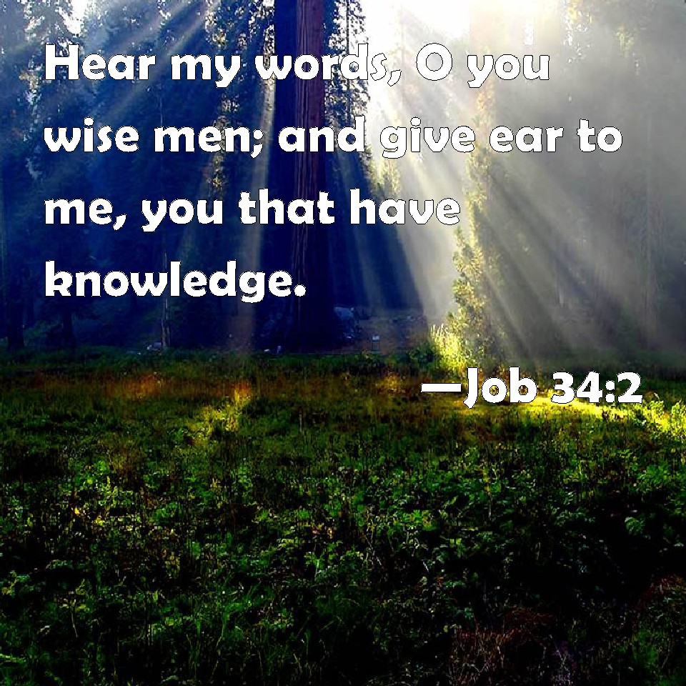 Choose a Background Job 34:2 Hear my words, O you wise men; and give ear to me, you that have knowledge. KJV: Hear my words, O ye wise men; and give ear unto me, ye that have knowledge. DRB: Hear ye, wise men, my words, and ye learned, hearken to me : DBT: Hear my words, ye wise men; and give ear unto me, ye that have knowledge. ERV: Hear my words, ye wise men; and give ear unto me, ye that have knowledge. WBT: Hear my words, O ye wise men; and give ear to me, ye that have knowledge. WEB: "Hear my words, you wise men. Give ear to me, you who have knowledge. YLT: Hear, O wise men, my words, And, O knowing ones, give ear to me.Links Job 34:2 NIV • Job 34:2 NLT • Job 34:2 ESV • Job 34:2 NASB • Job 34:2 KJV • Job 34:2 Interlinear • Job 34:2 Commentaries • Job 34:2 Parallel Texts • Job 34:2 Bible Apps • Job 34:2 Parallel • Bible Hub |