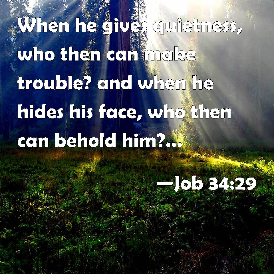 Choose a Background Job 34:29 When he gives quietness, who then can make trouble? and when he hides his face, who then can behold him? whether it be done against a nation, or against a man only: KJV: When he giveth quietness, who then can make trouble? and when he hideth his face, who then can behold him? whether it be done against a nation, or against a man only: DRB: For when he granteth peace, who is there that can condemn? When he hideth his countenance, who is there that can behold him, whether it regard nations, or all men? DBT: When he giveth quietness, who then will disturb? and when he hideth his face, who shall behold him? and this towards a nation, or towards a man alike; ERV: When he giveth quietness, who then can condemn? and when he hideth his face, who then can behold him? whether it be done unto a nation, or unto a man, alike: WBT: When he giveth quietness, who then can make trouble? and when he hideth his face, who then can behold him? whether it be done against a nation, or against a man only: WEB: When he gives quietness, who then can condemn? When he hides his face, who then can see him? Alike whether to a nation, or to a man, YLT: And He giveth rest, and who maketh wrong? And hideth the face, and who beholdeth it? And in reference to a nation and to a man, It is the same.Links Job 34:29 NIV • Job 34:29 NLT • Job 34:29 ESV • Job 34:29 NASB • Job 34:29 KJV • Job 34:29 Interlinear • Job 34:29 Commentaries • Job 34:29 Parallel Texts • Job 34:29 Bible Apps • Job 34:29 Parallel • Bible Hub |