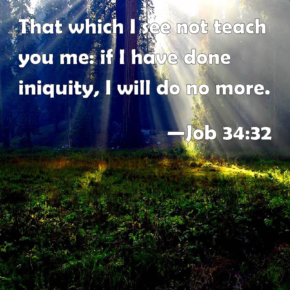 Choose a Background Job 34:32 That which I see not teach you me: if I have done iniquity, I will do no more. KJV: That which I see not teach thou me: if I have done iniquity, I will do no more. DRB: If I have erred, teach thou me : if I have spoken iniquity, I will add no more. DBT: What I see not, teach thou me; if I have done wrong, I will do so no more? ERV: That which I see not teach thou me: if I have done iniquity, I will do it no more? WBT: That which I see not teach thou me: if I have done iniquity, I will do no more. WEB: Teach me that which I don't see. If I have done iniquity, I will do it no more'? YLT: Besides that which I see, shew Thou me, If iniquity I have done — I do not add?'Links Job 34:32 NIV • Job 34:32 NLT • Job 34:32 ESV • Job 34:32 NASB • Job 34:32 KJV • Job 34:32 Interlinear • Job 34:32 Commentaries • Job 34:32 Parallel Texts • Job 34:32 Bible Apps • Job 34:32 Parallel • Bible Hub |
