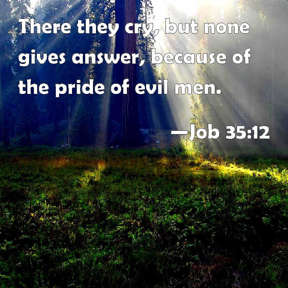 Choose a Background Job 35:12 There they cry, but none gives answer, because of the pride of evil men. KJV: There they cry, but none giveth answer, because of the pride of evil men. DRB: There shall they cry, and he will not hear, because of the pride of evil men. DBT: There they cry, and he answereth not, because of the pride of evil men. ERV: There they cry, but none giveth answer, because of the pride of evil men. WBT: There they cry, but none giveth answer, because of the pride of evil men. WEB: There they cry, but none gives answer, because of the pride of evil men. YLT: There they cry, and He doth not answer, Because of the pride of evil doers.Links Job 35:12 NIV • Job 35:12 NLT • Job 35:12 ESV • Job 35:12 NASB • Job 35:12 KJV • Job 35:12 Interlinear • Job 35:12 Commentaries • Job 35:12 Parallel Texts • Job 35:12 Bible Apps • Job 35:12 Parallel • Bible Hub |