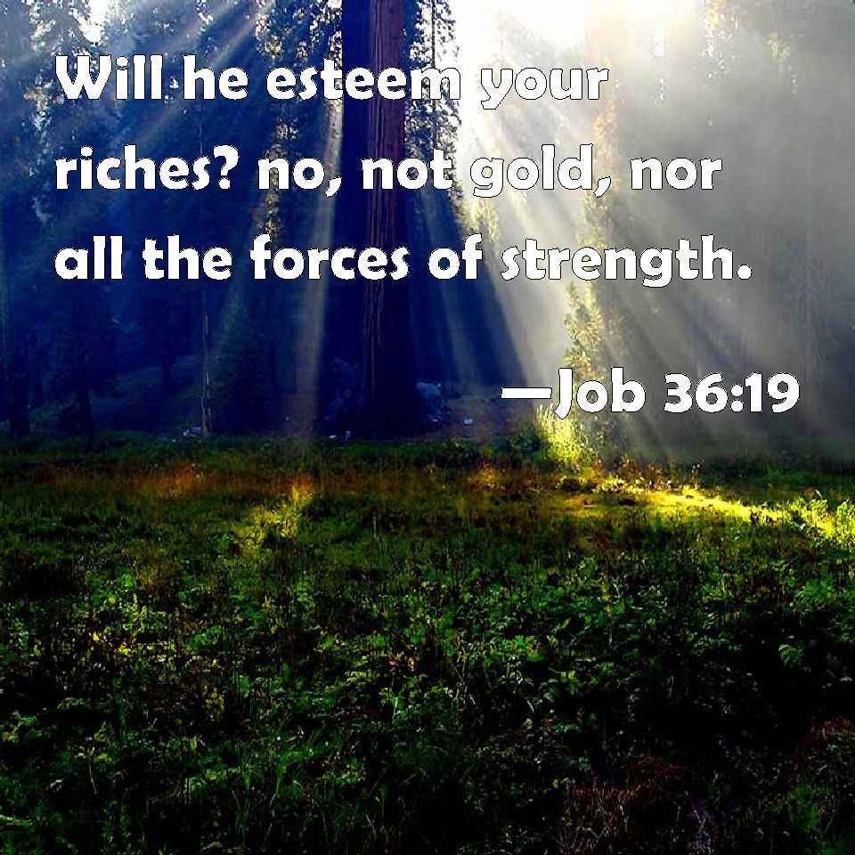 Choose a Background Job 36:19 Will he esteem your riches? no, not gold, nor all the forces of strength. KJV: Will he esteem thy riches? no, not gold, nor all the forces of strength. DRB: Lay down thy greatness without tribulation, and all the mighty of strength. DBT: Will he esteem thy riches? Not gold, nor all the resources of strength! ERV: Will thy riches suffice, that thou be not in distress, or all the forces of thy strength? WBT: Will he esteem thy riches? no, not gold, nor all the forces of strength. WEB: Would your wealth sustain you in distress, or all the might of your strength? YLT: Doth He value thy riches? He hath gold, and all the forces of power.Links Job 36:19 NIV • Job 36:19 NLT • Job 36:19 ESV • Job 36:19 NASB • Job 36:19 KJV • Job 36:19 Interlinear • Job 36:19 Commentaries • Job 36:19 Parallel Texts • Job 36:19 Bible Apps • Job 36:19 Parallel • Bible Hub |