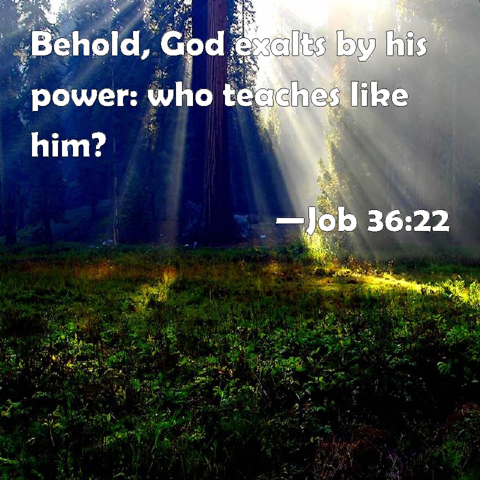 Choose a Background Job 36:22 Behold, God exalts by his power: who teaches like him? KJV: Behold, God exalteth by his power: who teacheth like him? DRB: Behold, God is high in his strength, and none is like him among the lawgivers. DBT: Lo, God is exalted in his power: who teacheth as he? ERV: Behold, God doeth loftily in his power: who is a teacher like unto him? WBT: Behold, God exalteth by his power: who teacheth like him? WEB: Behold, God is exalted in his power. Who is a teacher like him? YLT: Lo, God doth sit on high by His power, Who is like Him — a teacher?Links Job 36:22 NIV • Job 36:22 NLT • Job 36:22 ESV • Job 36:22 NASB • Job 36:22 KJV • Job 36:22 Interlinear • Job 36:22 Commentaries • Job 36:22 Parallel Texts • Job 36:22 Bible Apps • Job 36:22 Parallel • Bible Hub |