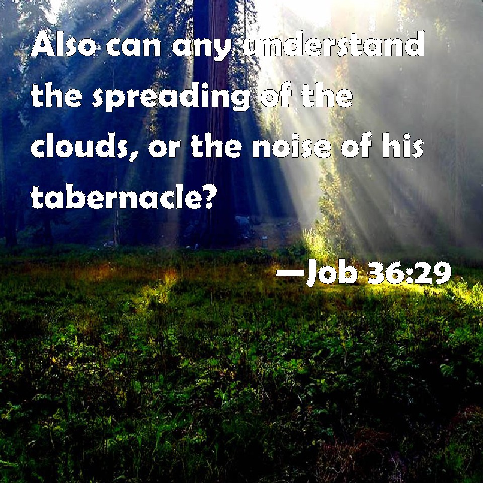 Choose a Background Job 36:29 Also can any understand the spreading of the clouds, or the noise of his tabernacle? KJV: Also can any understand the spreadings of the clouds, or the noise of his tabernacle? DRB: If he will spread out clouds as his tent, DBT: But can any understand the spreadings of the clouds, or the crashing of his pavilion? ERV: Yea, can any understand the spreadings of the clouds, the thunderings of his pavilion? WBT: Also can any understand the spreadings of the clouds, or the noise of his tabernacle? WEB: Yes, can any understand the spreading of the clouds, and the thunderings of his pavilion? YLT: Yea, doth any understand The spreadings out of a cloud? The noises of His tabernacle?Links Job 36:29 NIV • Job 36:29 NLT • Job 36:29 ESV • Job 36:29 NASB • Job 36:29 KJV • Job 36:29 Interlinear • Job 36:29 Commentaries • Job 36:29 Parallel Texts • Job 36:29 Bible Apps • Job 36:29 Parallel • Bible Hub |