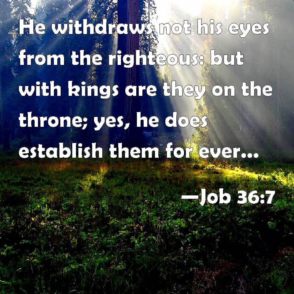 Choose a Background Job 36:7 He withdraws not his eyes from the righteous: but with kings are they on the throne; yes, he does establish them for ever, and they are exalted. KJV: He withdraweth not his eyes from the righteous: but with kings are they on the throne; yea, he doth establish them for ever, and they are exalted. DRB: He will not take away his eyes from the just, and he placeth kings on the throne for ever, and they are exalted. DBT: He withdraweth not his eyes from the righteous, but with kings on the throne doth he even set them for ever; and they are exalted. ERV: He withdraweth not his eyes from the righteous: but with kings upon the throne he setteth them for ever, and they are exalted. WBT: He withdraweth not his eyes from the righteous: but with kings are they on the throne; yes, he doth establish them for ever, and they are exalted. WEB: He doesn't withdraw his eyes from the righteous, but with kings on the throne, he sets them forever, and they are exalted. YLT: He withdraweth not from the righteous His eyes, And from kings on the throne, And causeth them to sit for ever, and they are high,Links Job 36:7 NIV • Job 36:7 NLT • Job 36:7 ESV • Job 36:7 NASB • Job 36:7 KJV • Job 36:7 Interlinear • Job 36:7 Commentaries • Job 36:7 Parallel Texts • Job 36:7 Bible Apps • Job 36:7 Parallel • Bible Hub |