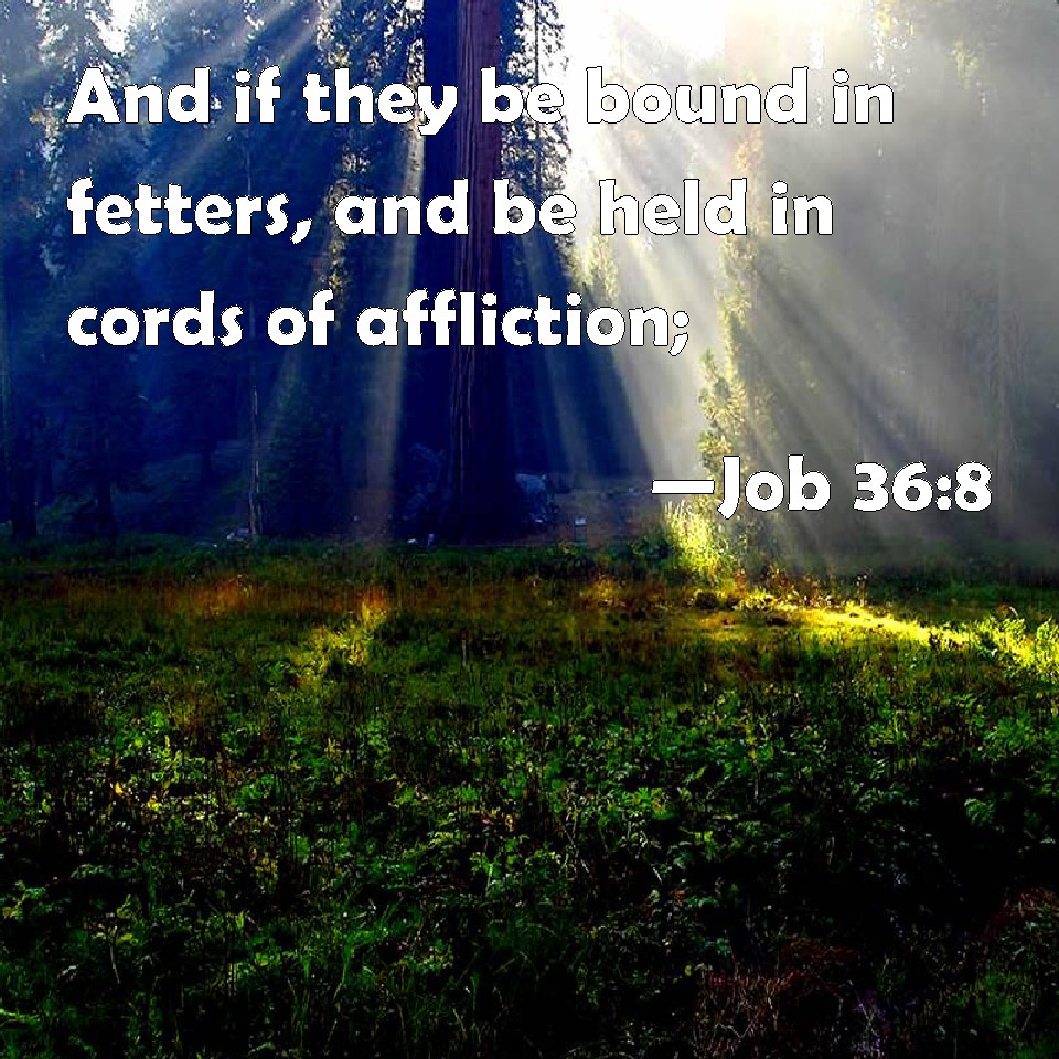 Choose a Background Job 36:8 And if they be bound in fetters, and be held in cords of affliction; KJV: And if they be bound in fetters, and be holden in cords of affliction; DRB: And if they shall be in chains, and be bound with the cords of poverty : DBT: And if, bound in fetters, they be held in cords of affliction, ERV: And if they be bound in fetters, and be taken in the cords of affliction; WBT: And if they are bound in fetters, and are held in cords of affliction; WEB: If they are bound in fetters, and are taken in the cords of afflictions, YLT: And if prisoners in fetters They are captured with cords of affliction,Links Job 36:8 NIV • Job 36:8 NLT • Job 36:8 ESV • Job 36:8 NASB • Job 36:8 KJV • Job 36:8 Interlinear • Job 36:8 Commentaries • Job 36:8 Parallel Texts • Job 36:8 Bible Apps • Job 36:8 Parallel • Bible Hub |