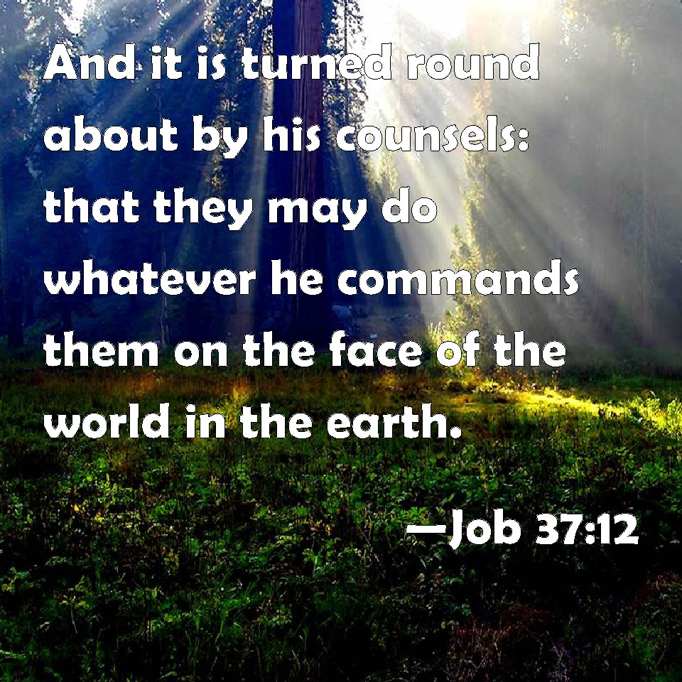 Job 37:12 And it is turned round about by his counsels: that they may do whatever he commands them on the face of the world in the earth.