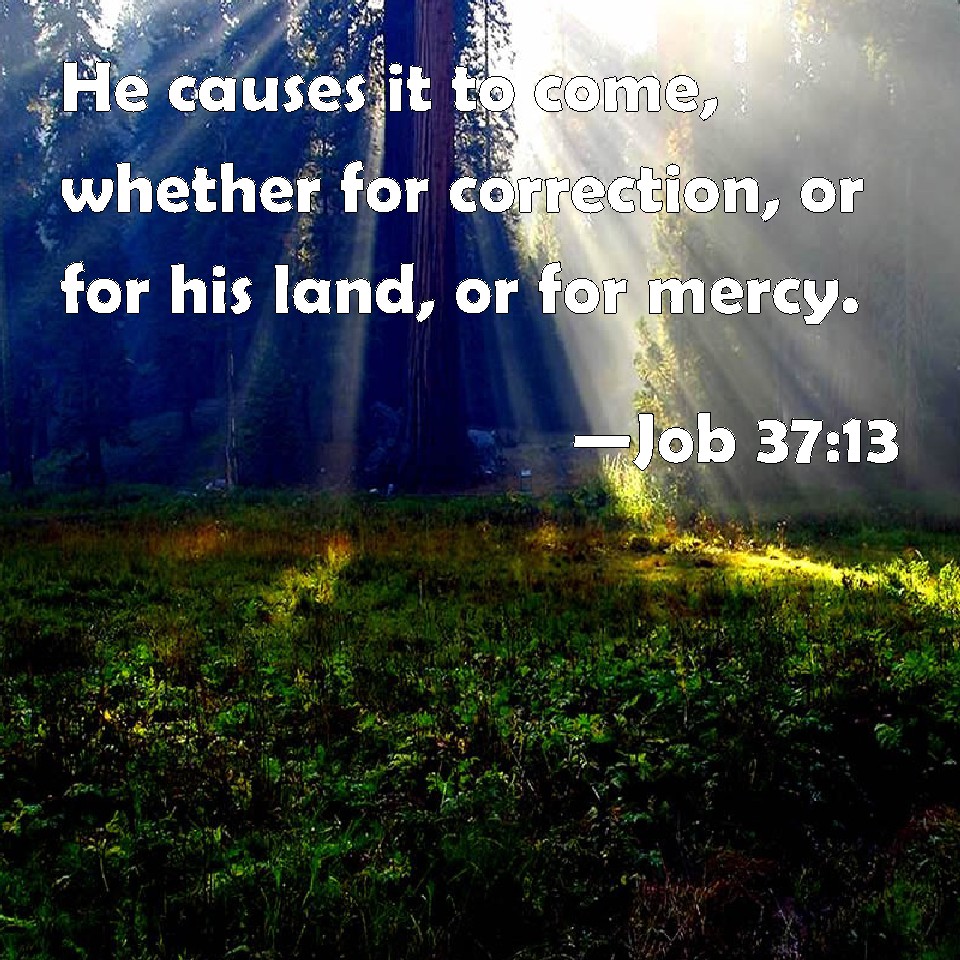 Choose a Background Job 37:13 He causes it to come, whether for correction, or for his land, or for mercy. KJV: He causeth it to come, whether for correction, or for his land, or for mercy. DRB: Whether in one tribe, or in his own land, or in what place soever of his mercy he shall command them to be found. DBT: Whether he cause it to come as a rod, or for his land, or in mercy. ERV: Whether it be for correction, or for his land, or for mercy, that he cause it to come. WBT: He causeth it to come, whether for correction, or for his land, or for mercy. WEB: Whether it is for correction, or for his land, or for loving kindness, that he causes it to come. YLT: Whether for a rod, or for His land, Or for kindness — He doth cause it to come.Links Job 37:13 NIV • Job 37:13 NLT • Job 37:13 ESV • Job 37:13 NASB • Job 37:13 KJV • Job 37:13 Interlinear • Job 37:13 Commentaries • Job 37:13 Parallel Texts • Job 37:13 Bible Apps • Job 37:13 Parallel • Bible Hub |