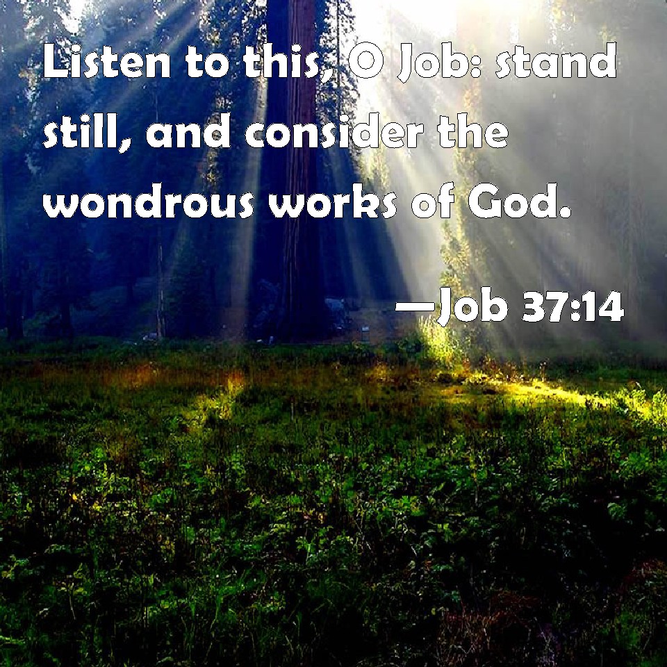 Choose a Background Job 37:14 Listen to this, O Job: stand still, and consider the wondrous works of God. KJV: Hearken unto this, O Job: stand still, and consider the wondrous works of God. DRB: Hearken to these things, Job : Stand, and consider the wondrous works of God. DBT: Hearken unto this, Job; stand still and discern the wondrous works of God. ERV: Hearken unto this, O Job: stand still, and consider the wondrous works of God. WBT: Hearken to this, O Job: stand still, and consider the wondrous works of God. WEB: "Listen to this, Job. Stand still, and consider the wondrous works of God. YLT: Hear this, O Job, Stand and consider the wonders of God.Links Job 37:14 NIV • Job 37:14 NLT • Job 37:14 ESV • Job 37:14 NASB • Job 37:14 KJV • Job 37:14 Interlinear • Job 37:14 Commentaries • Job 37:14 Parallel Texts • Job 37:14 Bible Apps • Job 37:14 Parallel • Bible Hub |
