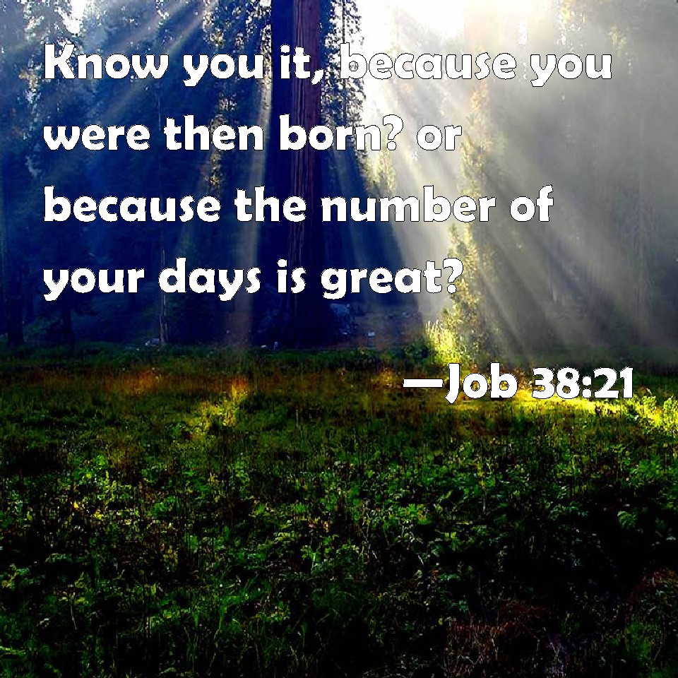 Choose a Background Job 38:21 Know you it, because you were then born? or because the number of your days is great? KJV: Knowest thou it, because thou wast then born? or because the number of thy days is great? DRB: Didst thou know then that thou shouldst be born ? and didst thou know the number of thy days? DBT: Thou knowest, for thou wast then born, and the number of thy days is great! ERV: Doubtless, thou knowest, for thou wast then born, and the number of thy days is great! WBT: Knowest thou it, because thou wast then born? or because the number of thy days is great? WEB: Surely you know, for you were born then, and the number of your days is great! YLT: Thou hast known — for then thou art born And the number of thy days are many!Links Job 38:21 NIV • Job 38:21 NLT • Job 38:21 ESV • Job 38:21 NASB • Job 38:21 KJV • Job 38:21 Interlinear • Job 38:21 Commentaries • Job 38:21 Parallel Texts • Job 38:21 Bible Apps • Job 38:21 Parallel • Bible Hub |