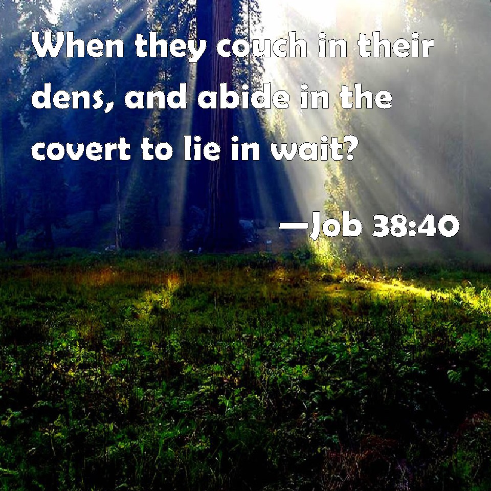 Job 38:40 When they couch in their dens, and abide in the covert to lie in wait?