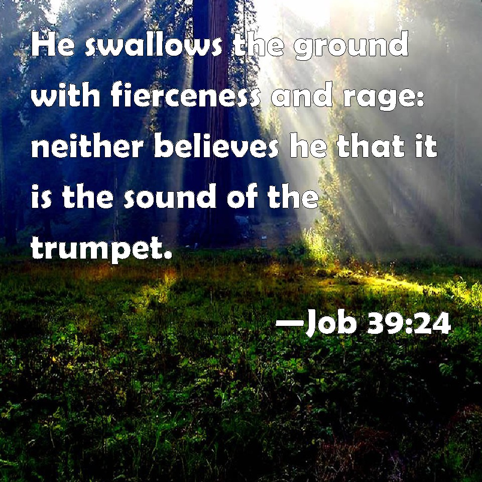 Job 39:24 He swallows the ground with fierceness and rage: neither believes he that it is the sound of the trumpet.