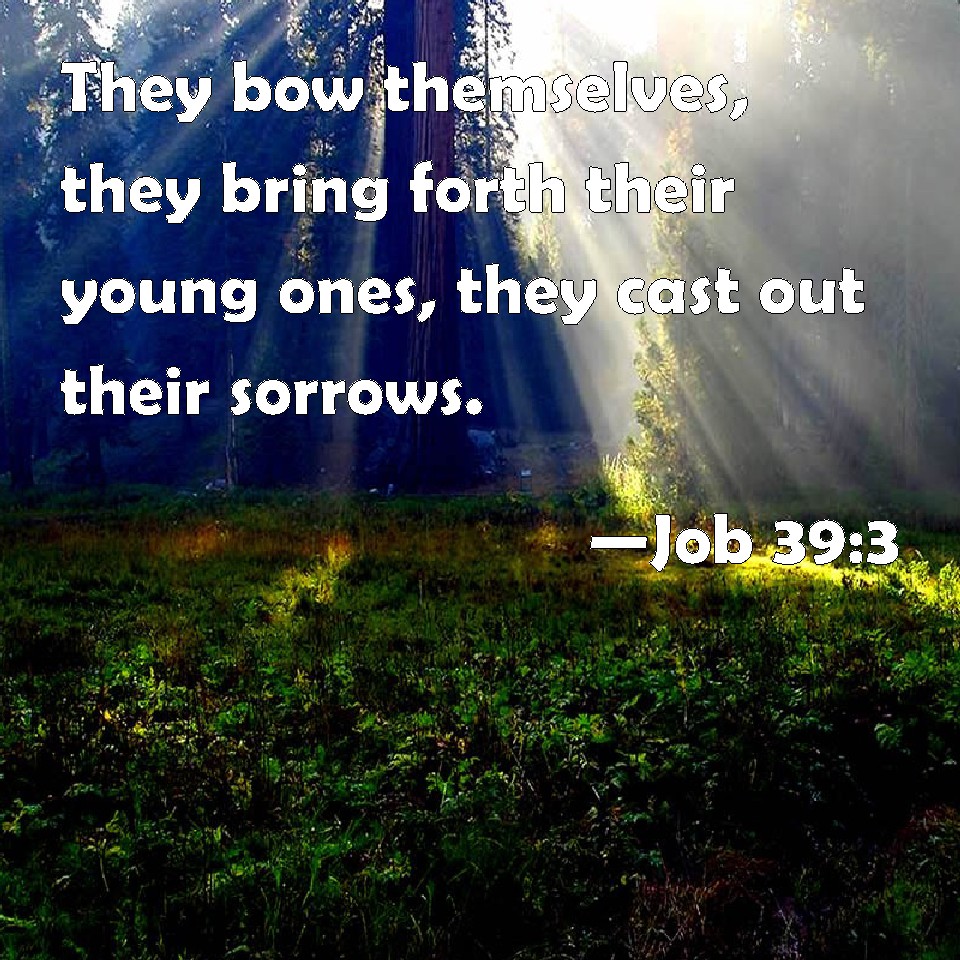 Choose a Background Job 39:3 They bow themselves, they bring forth their young ones, they cast out their sorrows. KJV: They bow themselves, they bring forth their young ones, they cast out their sorrows. DRB: They bow themselves to bring forth young, and they cast them, and send forth roarings. DBT: They bow themselves, they give birth to their young ones, they cast out their pains; ERV: They bow themselves, they bring forth their young, they cast out their sorrows. WBT: They bow themselves, they bring forth their young ones, they cast out their sorrows. WEB: They bow themselves, they bring forth their young, they end their labor pains. YLT: They bow down, Their young ones they bring forth safely, Their pangs they cast forth.Links Job 39:3 NIV • Job 39:3 NLT • Job 39:3 ESV • Job 39:3 NASB • Job 39:3 KJV • Job 39:3 Interlinear • Job 39:3 Commentaries • Job 39:3 Parallel Texts • Job 39:3 Bible Apps • Job 39:3 Parallel • Bible Hub |