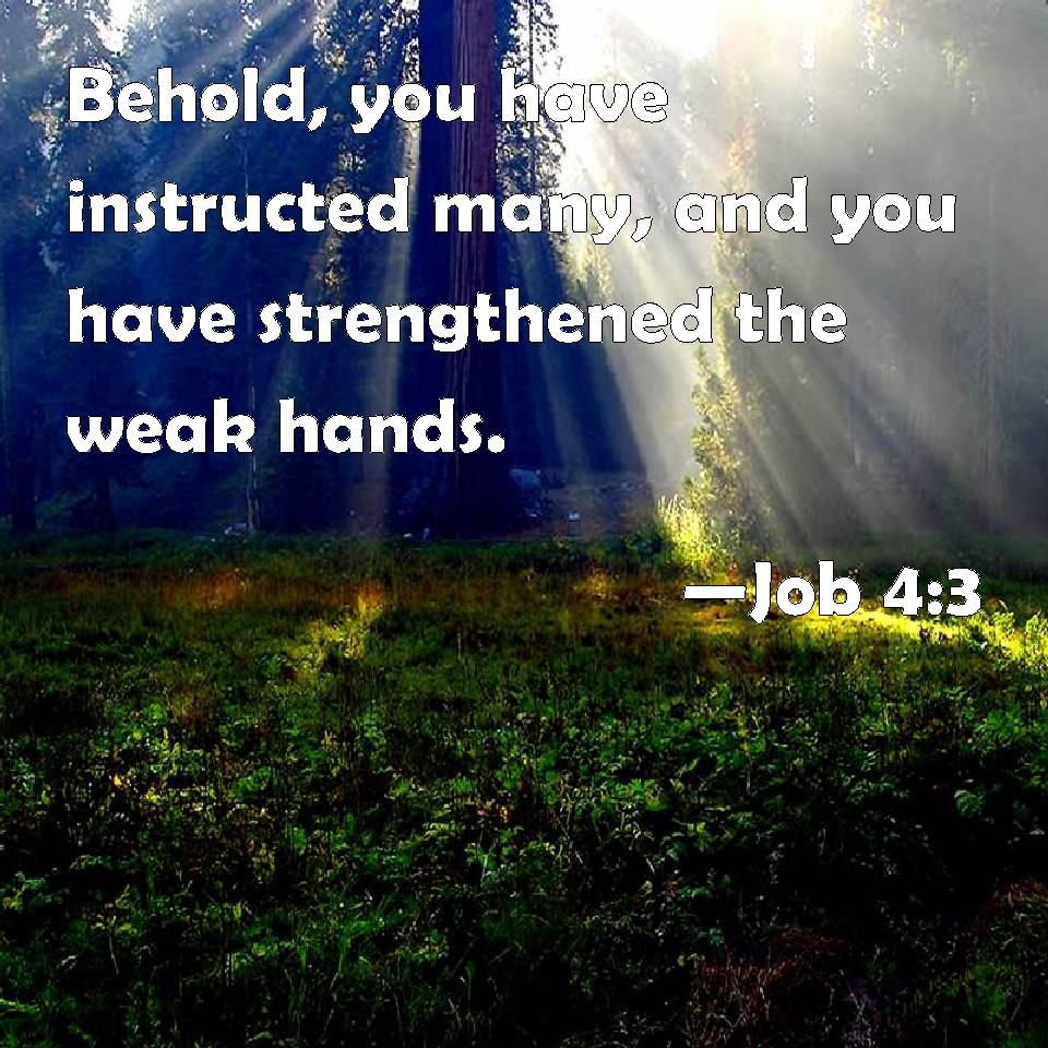 Choose a Background Job 4:3 Behold, you have instructed many, and you have strengthened the weak hands. KJV: Behold, thou hast instructed many, and thou hast strengthened the weak hands. DRB: Behold thou hast taught many, and thou hast strengthened the weary hands: DBT: Behold, thou hast instructed many, and thou hast strengthened the weak hands; ERV: Behold, thou hast instructed many, and thou hast strengthened the weak hands. WBT: Behold, thou hast instructed many, and thou hast strengthened the weak hands. WEB: Behold, you have instructed many, you have strengthened the weak hands. YLT: Lo, thou hast instructed many, And feeble hands thou makest strong.Links Job 4:3 NIV • Job 4:3 NLT • Job 4:3 ESV • Job 4:3 NASB • Job 4:3 KJV • Job 4:3 Interlinear • Job 4:3 Commentaries • Job 4:3 Parallel Texts • Job 4:3 Bible Apps • Job 4:3 Parallel • Bible Hub |