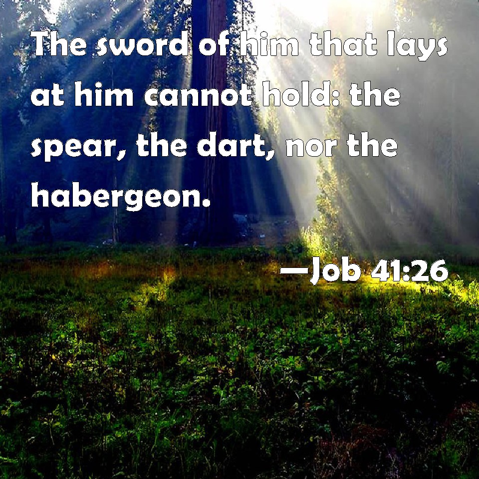 Choose a Background Job 41:26 The sword of him that lays at him cannot hold: the spear, the dart, nor the habergeon. KJV: The sword of him that layeth at him cannot hold: the spear, the dart, nor the habergeon. DRB: When a sword shall lay at him, it shall not be able to hold, nor a spear, nor a breastplate. DBT: If any reach him with a sword, it cannot hold; neither spear, nor dart, nor harpoon. ERV: If one lay at him with the sword, it cannot avail; nor the spear, the dart, nor the pointed shaft. WBT: The sword of him that attacketh him cannot hold: the spear, the dart, nor the habergeon. WEB: If one attacks him with the sword, it can't prevail; nor the spear, the dart, nor the pointed shaft. YLT: The sword of his overtaker standeth not, Spear — dart — and lance.Links Job 41:26 NIV • Job 41:26 NLT • Job 41:26 ESV • Job 41:26 NASB • Job 41:26 KJV • Job 41:26 Interlinear • Job 41:26 Commentaries • Job 41:26 Parallel Texts • Job 41:26 Bible Apps • Job 41:26 Parallel • Bible Hub |