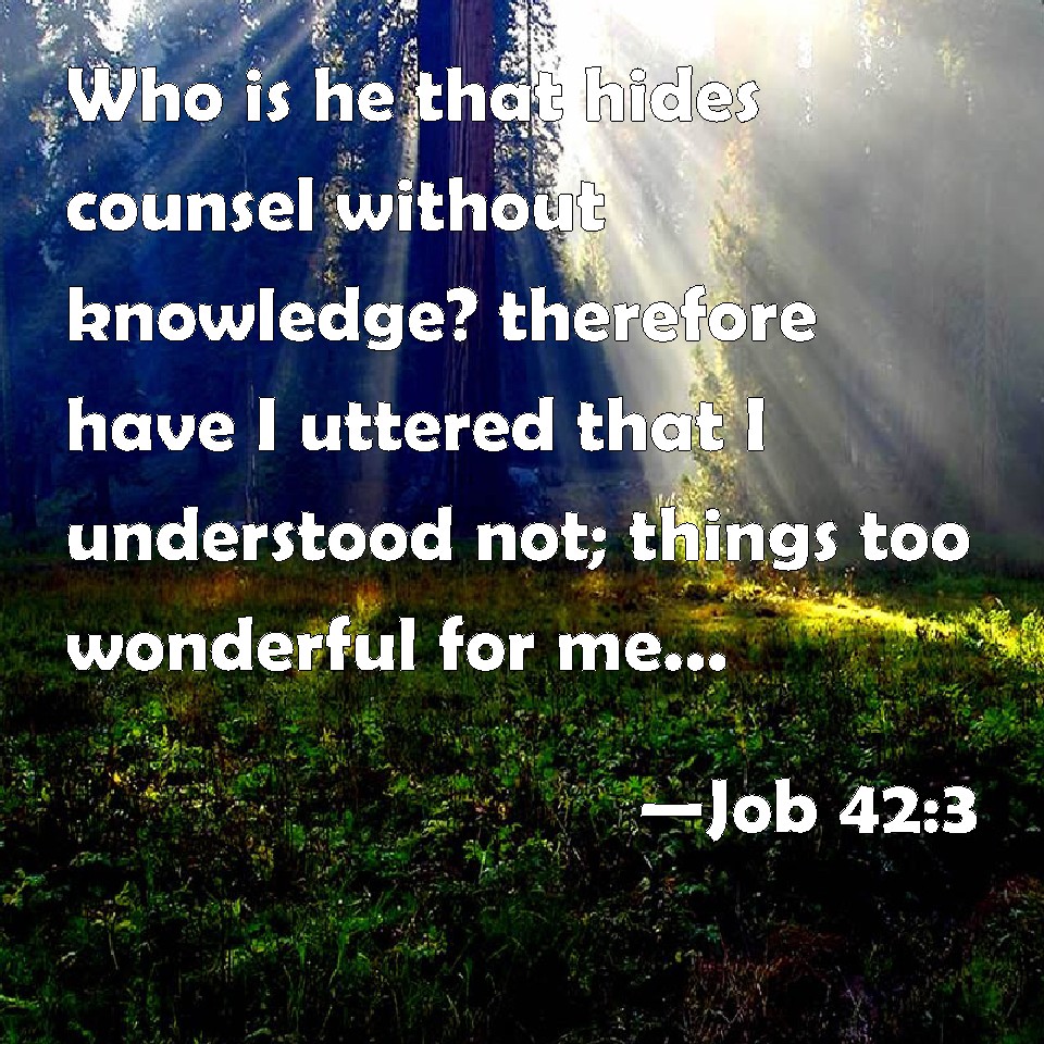 Choose a Background Job 42:3 Who is he that hides counsel without knowledge? therefore have I uttered that I understood not; things too wonderful for me, which I knew not. KJV: Who is he that hideth counsel without knowledge? therefore have I uttered that I understood not; things too wonderful for me, which I knew not. DRB: Who is this that hideth counsel without knowledge? Therefore I have spoken unwisely, and things that above measure exceeded my knowledge. DBT: Who is he that obscureth counsel without knowledge? therefore have I uttered what I did not understand; things too wonderful for me, which I knew not. ERV: Who is this that hideth counsel without knowledge? therefore have I uttered that which I understood not, things too wonderful for me, which I knew not. WBT: Who is he that hideth counsel without knowledge? therefore have I uttered that which I understood not; things too wonderful for me, which I knew not. WEB: You asked, 'Who is this who hides counsel without knowledge?' therefore I have uttered that which I did not understand, things too wonderful for me, which I didn't know. YLT: Who is this, hiding counsel without knowledge?' Therefore, I have declared, and understand not, Too wonderful for me, and I know not.Links Job 42:3 NIV • Job 42:3 NLT • Job 42:3 ESV • Job 42:3 NASB • Job 42:3 KJV • Job 42:3 Interlinear • Job 42:3 Commentaries • Job 42:3 Parallel Texts • Job 42:3 Bible Apps • Job 42:3 Parallel • Bible Hub |