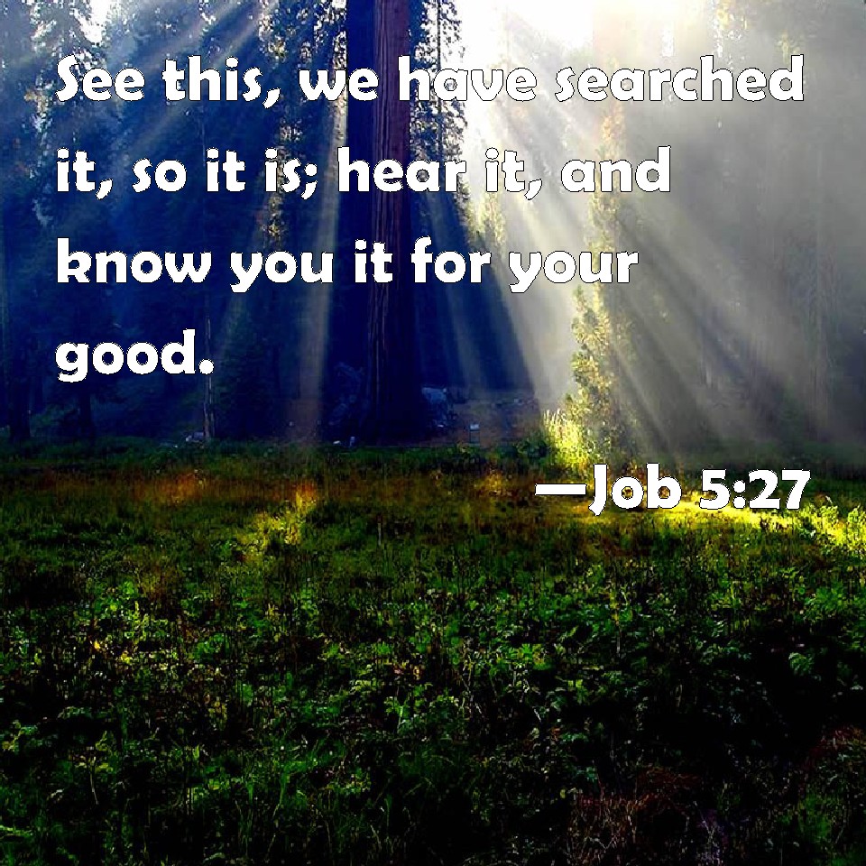 Choose a Background Job 5:27 See this, we have searched it, so it is; hear it, and know you it for your good. KJV: Lo this, we have searched it, so it is; hear it, and know thou it for thy good. DRB: Behold, this is even so, as we have searched oat: which thou having heard, consider it thoroughly in thy mind. DBT: Behold this, we have searched it out, so it is; hear it, and know thou it for thyself. ERV: Lo this, we have searched it, so it is; hear it, and know thou it for thy good. WBT: Lo this, we have searched it, so it is; hear it, and know thou it for thy good. WEB: Look this, we have searched it, so it is. Hear it, and know it for your good." YLT: Lo, this — we searched it out — it is right, hearken; And thou, know for thyself!Links Job 5:27 NIV • Job 5:27 NLT • Job 5:27 ESV • Job 5:27 NASB • Job 5:27 KJV • Job 5:27 Interlinear • Job 5:27 Commentaries • Job 5:27 Parallel Texts • Job 5:27 Bible Apps • Job 5:27 Parallel • Bible Hub |