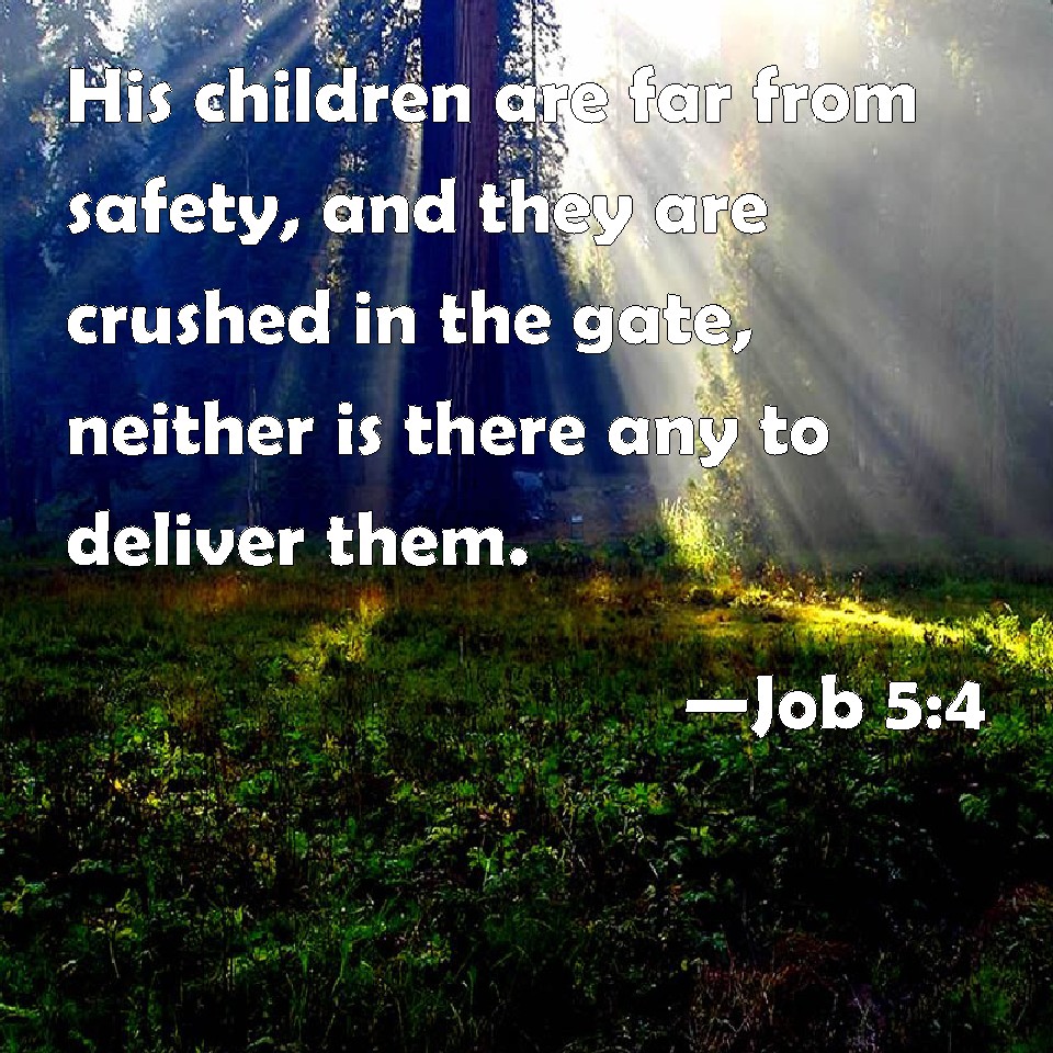 Choose a Background Job 5:4 His children are far from safety, and they are crushed in the gate, neither is there any to deliver them. KJV: His children are far from safety, and they are crushed in the gate, neither is there any to deliver them. DRB: His children shall be far from safety, and shall be destroyed in the gate, and there shall be none to deliver them. DBT: His children are far from safety, and they are crushed in the gate, and there is no deliverer: ERV: His children are far from safety, and they are crushed in the gate, neither is there any to deliver them. WBT: His children are far from safety, and they are crushed in the gate, neither is there any to deliver them. WEB: His children are far from safety. They are crushed in the gate. Neither is there any to deliver them, YLT: Far are his sons from safety, And they are bruised in the gate, And there is no deliverer.Links Job 5:4 NIV • Job 5:4 NLT • Job 5:4 ESV • Job 5:4 NASB • Job 5:4 KJV • Job 5:4 Interlinear • Job 5:4 Commentaries • Job 5:4 Parallel Texts • Job 5:4 Bible Apps • Job 5:4 Parallel • Bible Hub |