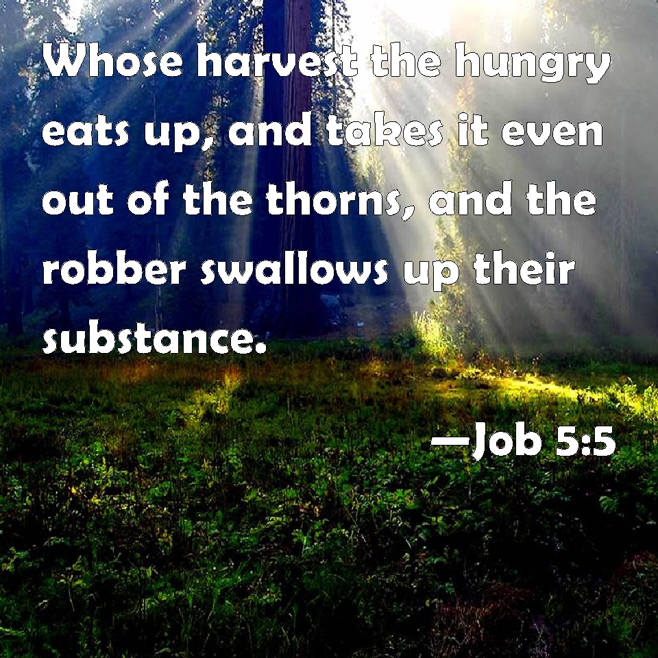 Choose a Background Job 5:5 Whose harvest the hungry eats up, and takes it even out of the thorns, and the robber swallows up their substance. KJV: Whose harvest the hungry eateth up, and taketh it even out of the thorns, and the robber swalloweth up their substance. DRB: Whose harvest the hungry shall eat, and the armed man shall take him by violence, and the thirsty shall drink up his riches. DBT: Whose harvest the hungry eateth up, and taketh even out of the thorns; and the snare gapeth for his substance. ERV: Whose harvest the hungry eateth up, and taketh it even out of the thorns, and the snare gapeth for their substance. WBT: Whose harvest the hungry eateth up, and taketh it even out of the thorns, and the robber swalloweth up their substance. WEB: whose harvest the hungry eats up, and take it even out of the thorns. The snare gapes for their substance. YLT: Whose harvest the hungry doth eat, And even from the thorns taketh it, And the designing swallowed their wealth.Links Job 5:5 NIV • Job 5:5 NLT • Job 5:5 ESV • Job 5:5 NASB • Job 5:5 KJV • Job 5:5 Interlinear • Job 5:5 Commentaries • Job 5:5 Parallel Texts • Job 5:5 Bible Apps • Job 5:5 Parallel • Bible Hub |