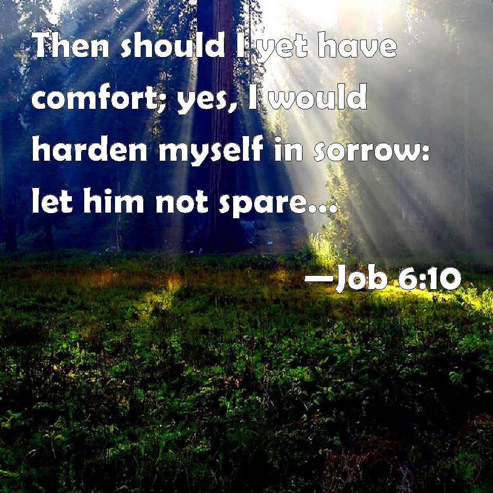 Choose a Background Job 6:10 Then should I yet have comfort; yes, I would harden myself in sorrow: let him not spare; for I have not concealed the words of the Holy One. KJV: Then should I yet have comfort; yea, I would harden myself in sorrow: let him not spare; for I have not concealed the words of the Holy One. DRB: And that this may be my comfort, that afflicting me with sorrow, he spare not, nor I contradict the words of the Holy One. DBT: Then should I yet have comfort; and in the pain which spareth not I would rejoice that I have not denied the words of the Holy One. ERV: Then should I yet have comfort; yea, I would exult in pain that spareth not: for I have not denied the words of the Holy One. WBT: Then should I yet have comfort; yes, I would harden myself in sorrow: let him not spare; for I have not concealed the words of the Holy One. WEB: Be it still my consolation, yes, let me exult in pain that doesn't spare, that I have not denied the words of the Holy One. YLT: And yet it is my comfort, (And I exult in pain — He doth not spare,) That I have not hidden The sayings of the Holy One.Links Job 6:10 NIV • Job 6:10 NLT • Job 6:10 ESV • Job 6:10 NASB • Job 6:10 KJV • Job 6:10 Interlinear • Job 6:10 Commentaries • Job 6:10 Parallel Texts • Job 6:10 Bible Apps • Job 6:10 Parallel • Bible Hub |