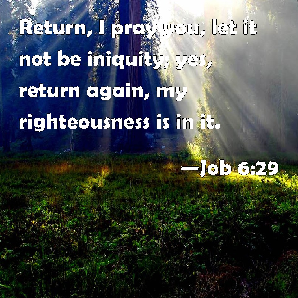 Choose a Background Job 6:29 Return, I pray you, let it not be iniquity; yes, return again, my righteousness is in it. KJV: Return, I pray you, let it not be iniquity; yea, return again, my righteousness is in it. DRB: Answer, I beseech you, without contention: and speaking that which is just, judge ye. DBT: Return, I pray you, let there be no wrong; yea, return again, my righteousness shall be in it. ERV: Return, I pray you, let there be no injustice; yea, return again, my cause is righteous. WBT: Return, I pray you, let it not be iniquity; yes, return again, my righteousness is in it. WEB: Please return. Let there be no injustice. Yes, return again. My cause is righteous. YLT: Turn back, I pray you, let it not be perverseness, Yea, turn back again — my righteousness is in it.Links Job 6:29 NIV • Job 6:29 NLT • Job 6:29 ESV • Job 6:29 NASB • Job 6:29 KJV • Job 6:29 Interlinear • Job 6:29 Commentaries • Job 6:29 Parallel Texts • Job 6:29 Bible Apps • Job 6:29 Parallel • Bible Hub |