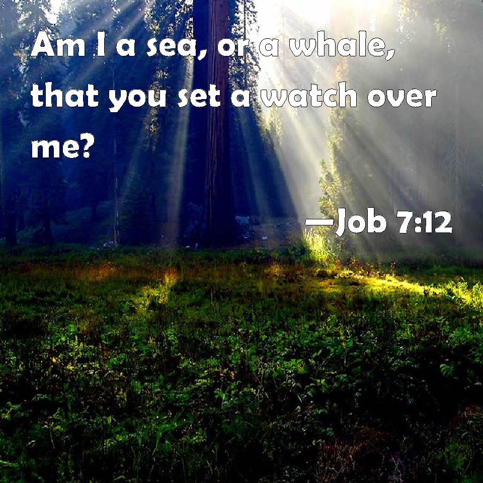 Choose a Background Job 7:12 Am I a sea, or a whale, that you set a watch over me? KJV: Am I a sea, or a whale, that thou settest a watch over me? DRB: Am I a sea, or a whale, that thou hast enclosed me in a prison? DBT: Am I a sea, or a sea-monster, that thou settest a watch over me? ERV: Am I a sea, or a sea-monster, that thou settest a watch over me? WBT: Am I a sea, or a whale, that thou settest a watch over me? WEB: Am I a sea, or a sea monster, that you put a guard over me? YLT: A sea -monster am I, or a dragon, That thou settest over me a guard?Links Job 7:12 NIV • Job 7:12 NLT • Job 7:12 ESV • Job 7:12 NASB • Job 7:12 KJV • Job 7:12 Interlinear • Job 7:12 Commentaries • Job 7:12 Parallel Texts • Job 7:12 Bible Apps • Job 7:12 Parallel • Bible Hub |