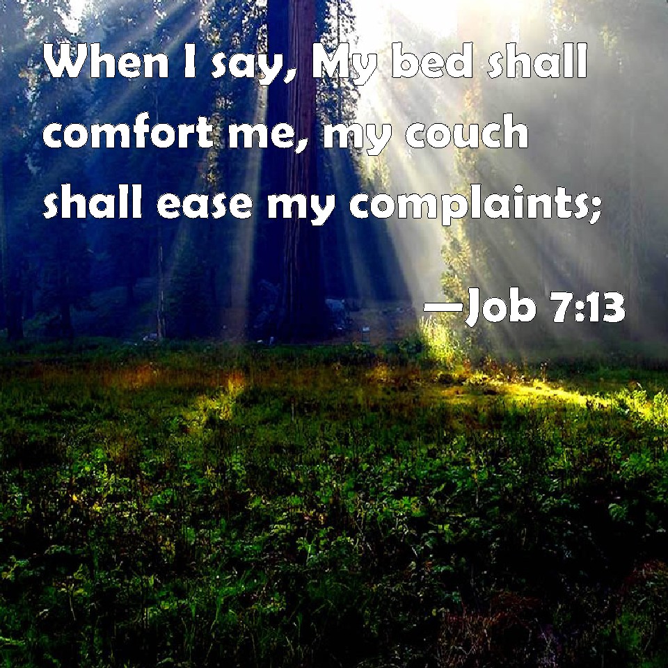 Choose a Background Job 7:13 When I say, My bed shall comfort me, my couch shall ease my complaints; KJV: When I say, My bed shall comfort me, my couch shall ease my complaint; DRB: If I say: My bed shall comfort me, and I shall be relieved speaking with myself on my couch: DBT: When I say, My bed shall comfort me, my couch shall ease my complaint; ERV: When I say, My bed shall comfort me, my couch shall ease my complaint; WBT: When I say, My bed shall comfort me, my couch shall ease my complaint; WEB: When I say, 'My bed shall comfort me. My couch shall ease my complaint;' YLT: When I said, 'My bed doth comfort me,' He taketh away in my talking my couch.Links Job 7:13 NIV • Job 7:13 NLT • Job 7:13 ESV • Job 7:13 NASB • Job 7:13 KJV • Job 7:13 Interlinear • Job 7:13 Commentaries • Job 7:13 Parallel Texts • Job 7:13 Bible Apps • Job 7:13 Parallel • Bible Hub |