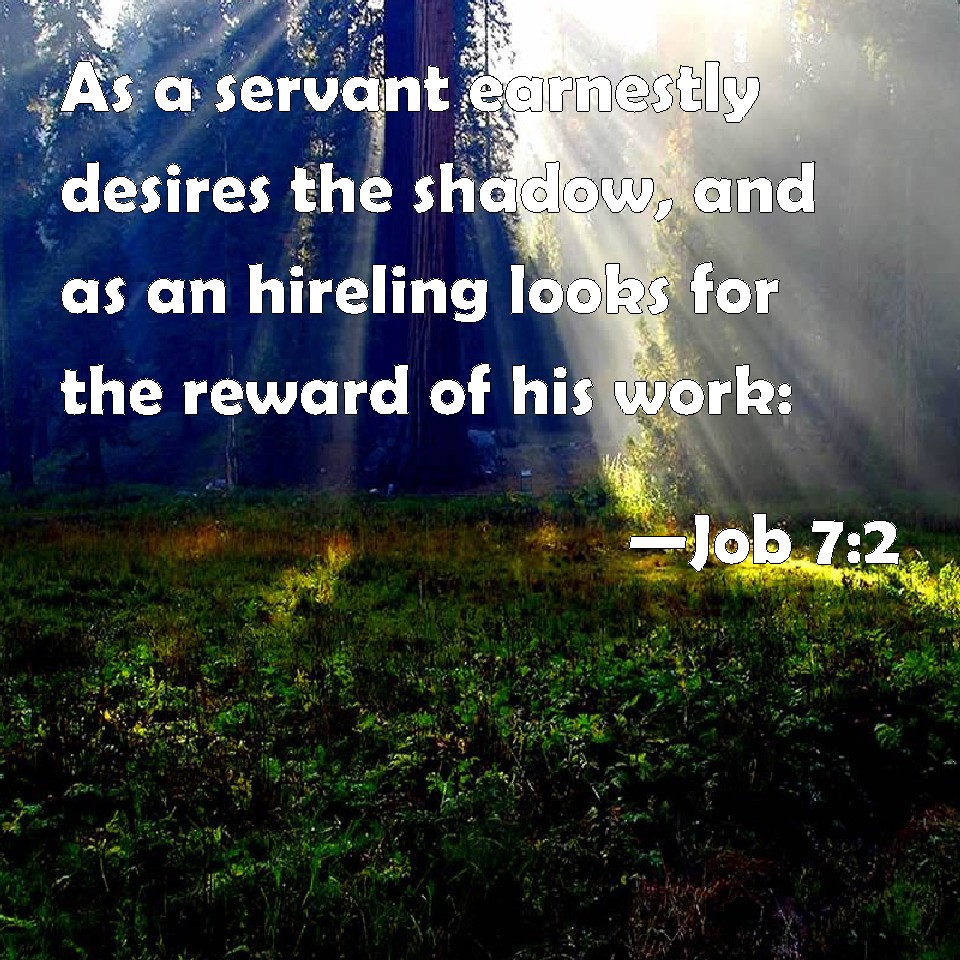 Choose a Background Job 7:2 As a servant earnestly desires the shadow, and as an hireling looks for the reward of his work: KJV: As a servant earnestly desireth the shadow, and as an hireling looketh for the reward of his work: DRB: As a servant longeth for the shade, as the hireling looketh for the end of his work; DBT: As a bondman earnestly desireth the shadow, and a hireling expecteth his wages, ERV: As a servant that earnestly desireth the shadow, and as an hireling that looketh for his wages: WBT: As a servant earnestly desireth the shadow, and as a hireling looketh for the reward of his work; WEB: As a servant who earnestly desires the shadow, as a hireling who looks for his wages, YLT: As a servant desireth the shadow, And as a hireling expecteth his wage,Links Job 7:2 NIV • Job 7:2 NLT • Job 7:2 ESV • Job 7:2 NASB • Job 7:2 KJV • Job 7:2 Interlinear • Job 7:2 Commentaries • Job 7:2 Parallel Texts • Job 7:2 Bible Apps • Job 7:2 Parallel • Bible Hub |