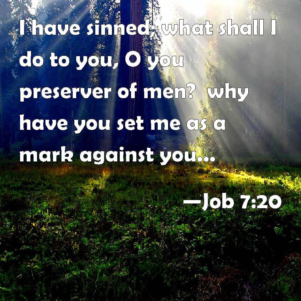 Choose a Background Job 7:20 I have sinned; what shall I do to you, O you preserver of men? why have you set me as a mark against you, so that I am a burden to myself? KJV: I have sinned; what shall I do unto thee, O thou preserver of men? why hast thou set me as a mark against thee, so that I am a burden to myself? DRB: I have sinned: what shall I do to thee, O keeper of men? why hast thou set me opposite to thee, and I am become burdensome to myself? DBT: Have I sinned, what do I unto thee, thou Observer of men? Why hast thou set me as an object of assault for thee, so that I am become a burden to myself? ERV: If I have sinned, what do I unto thee, O thou watcher of men? why hast thou set me as a mark for thee, so that I am a burden to myself? WBT: I have sinned; what shall I do to thee, O thou preserver of men? why hast thou set me as a mark against thee, so that I am a burden to myself? WEB: If I have sinned, what do I do to you, you watcher of men? Why have you set me as a mark for you, so that I am a burden to myself? YLT: I have sinned, what do I to Thee, O watcher of man? Why hast Thou set me for a mark to Thee, And I am for a burden to myself — and what?Links Job 7:20 NIV • Job 7:20 NLT • Job 7:20 ESV • Job 7:20 NASB • Job 7:20 KJV • Job 7:20 Interlinear • Job 7:20 Commentaries • Job 7:20 Parallel Texts • Job 7:20 Bible Apps • Job 7:20 Parallel • Bible Hub |