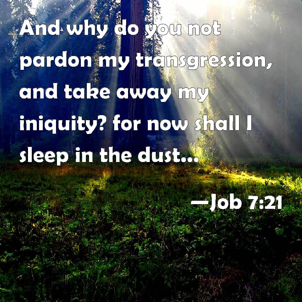 Choose a Background Job 7:21 And why do you not pardon my transgression, and take away my iniquity? for now shall I sleep in the dust; and you shall seek me in the morning, but I shall not be. KJV: And why dost thou not pardon my transgression, and take away mine iniquity? for now shall I sleep in the dust; and thou shalt seek me in the morning, but I shall not be. DRB: Why dost thou not remove my sin, and why dost thou not take away my iniquity? Behold now I shall sleep in the dust: and if thou seek me in the morning, I shall not be. DBT: And why dost not thou forgive my transgression and take away mine iniquity? for now shall I lie down in the dust, and thou shalt seek me early, and I shall not be. ERV: And why dost thou not pardon my transgression, and take away mine iniquity? for now shall I lie down in the dust; and thou shall seek me diligently, but I shall not be. WBT: And why dost thou not pardon my transgression, and take away my iniquity? for now shall I sleep in the dust; and thou shalt seek me in the morning, but I shall not be. WEB: Why do you not pardon my disobedience, and take away my iniquity? For now shall I lie down in the dust. You will seek me diligently, but I shall not be." YLT: Thou dost not take away my transgression, And cause to pass away mine iniquity, Because now, for dust I lie down: And Thou hast sought me — and I am not!Links Job 7:21 NIV • Job 7:21 NLT • Job 7:21 ESV • Job 7:21 NASB • Job 7:21 KJV • Job 7:21 Interlinear • Job 7:21 Commentaries • Job 7:21 Parallel Texts • Job 7:21 Bible Apps • Job 7:21 Parallel • Bible Hub |