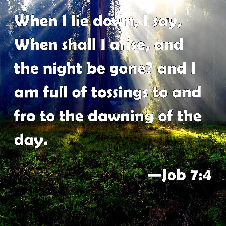 Choose a Background Job 7:4 When I lie down, I say, When shall I arise, and the night be gone? and I am full of tossings to and fro to the dawning of the day. KJV: When I lie down, I say, When shall I arise, and the night be gone? and I am full of tossings to and fro unto the dawning of the day. DRB: If I lie down to sleep, I shall say: When shall arise? and again I shall look for the evening, and shall be filled with sorrows even till darkness. DBT: If I lie down, I say, When shall I rise up, and the darkness be gone? and I am full of tossings until the dawn. ERV: When I lie down, I say, When shall I arise? but the night is long; and I am full of tossings to and fro unto the dawning of the day. WBT: When I lie down, I say, When shall I arise, and the night be gone? and I am full of tossings to and fro to the dawning of the day. WEB: When I lie down, I say, 'When shall I arise, and the night be gone?' I toss and turn until the dawning of the day. YLT: If I lay down then I said, 'When do I rise!' And evening hath been measured, And I have been full of tossings till dawn.Links Job 7:4 NIV • Job 7:4 NLT • Job 7:4 ESV • Job 7:4 NASB • Job 7:4 KJV • Job 7:4 Interlinear • Job 7:4 Commentaries • Job 7:4 Parallel Texts • Job 7:4 Bible Apps • Job 7:4 Parallel • Bible Hub |