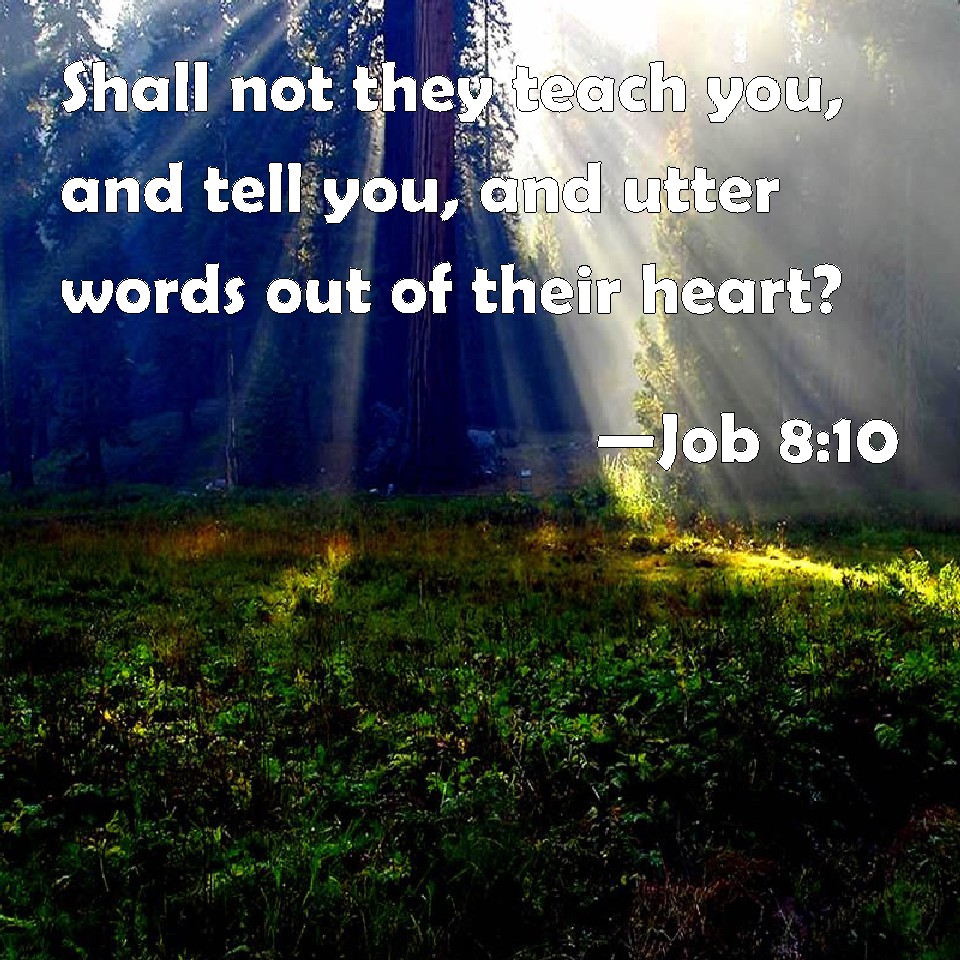 Choose a Background Job 8:10 Shall not they teach you, and tell you, and utter words out of their heart? KJV: Shall not they teach thee, and tell thee, and utter words out of their heart? DRB: And they shall teach thee: they shall speak to thee, and utter words out of their hearts. DBT: Shall not they teach thee, and tell thee, and utter words out of their heart? ERV: Shall not they teach thee, and tell thee, and utter words out of their heart? WBT: Will they not teach thee, and tell thee, and utter words out of their heart? WEB: Shall they not teach you, tell you, and utter words out of their heart? YLT: Do they not shew thee — speak to thee, And from their heart bring forth words?Links Job 8:10 NIV • Job 8:10 NLT • Job 8:10 ESV • Job 8:10 NASB • Job 8:10 KJV • Job 8:10 Interlinear • Job 8:10 Commentaries • Job 8:10 Parallel Texts • Job 8:10 Bible Apps • Job 8:10 Parallel • Bible Hub |