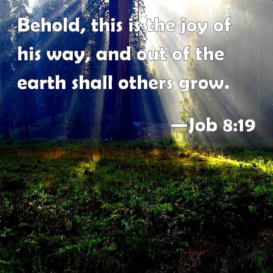 Choose a Background Job 8:19 Behold, this is the joy of his way, and out of the earth shall others grow. KJV: Behold, this is the joy of his way, and out of the earth shall others grow. DRB: For this is the joy of his way, that others may spring again out of the earth. DBT: Behold, this is the joy of his way, and out of the dust shall others grow. ERV: Behold, this is the joy of his way, and out of the earth shall others spring. WBT: Behold, this is the joy of his way, and out of the earth shall others grow. WEB: Behold, this is the joy of his way: out of the earth, others shall spring. YLT: Lo, this is the joy of his way, And from the dust others spring up.'Links Job 8:19 NIV • Job 8:19 NLT • Job 8:19 ESV • Job 8:19 NASB • Job 8:19 KJV • Job 8:19 Interlinear • Job 8:19 Commentaries • Job 8:19 Parallel Texts • Job 8:19 Bible Apps • Job 8:19 Parallel • Bible Hub |