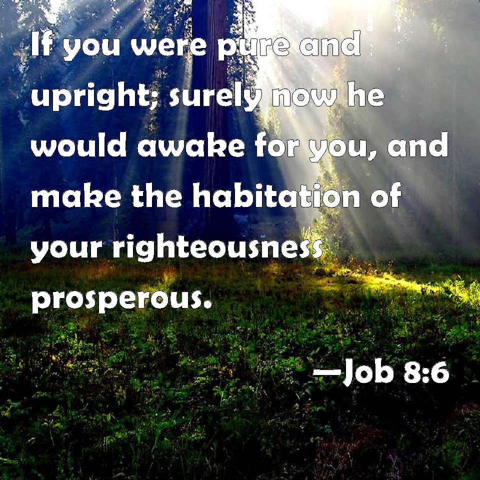 Choose a Background Job 8:6 If you were pure and upright; surely now he would awake for you, and make the habitation of your righteousness prosperous. KJV: If thou wert pure and upright; surely now he would awake for thee, and make the habitation of thy righteousness prosperous. DRB: If thou wilt walk clean and upright, he will presently awake onto thee, and will make the dwelling of thy justice peaceable: DBT: If thou be pure and upright, surely now he will awake for thee, and make the habitation of thy righteousness prosperous; ERV: If thou wert pure and upright; surely now he would awake for thee, and make the habitation of thy righteousness prosperous. WBT: If thou wert pure and upright; surely now he would awake for thee, and make the habitation of thy righteousness prosperous. WEB: If you were pure and upright, surely now he would awaken for you, and make the habitation of your righteousness prosperous. YLT: If pure and upright thou art, Surely now He waketh for thee, And hath completed The habitation of thy righteousness.Links Job 8:6 NIV • Job 8:6 NLT • Job 8:6 ESV • Job 8:6 NASB • Job 8:6 KJV • Job 8:6 Interlinear • Job 8:6 Commentaries • Job 8:6 Parallel Texts • Job 8:6 Bible Apps • Job 8:6 Parallel • Bible Hub |