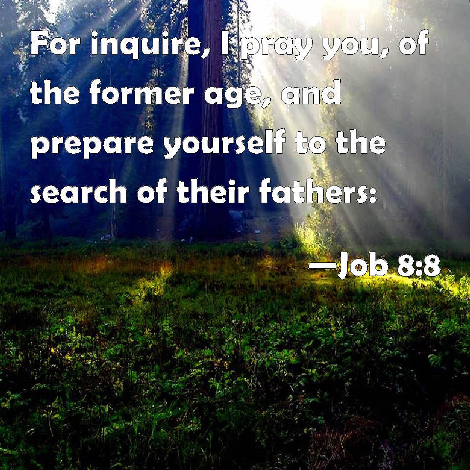 Choose a Background Job 8:8 For inquire, I pray you, of the former age, and prepare yourself to the search of their fathers: KJV: For inquire, I pray thee, of the former age, and prepare thyself to the search of their fathers: DRB: For inquire of the former generation, and search diligently into the memory of the fathers: DBT: For inquire, I pray thee, of the former generation, and attend to the researches of their fathers; ERV: For inquire, I pray thee, of the former age, and apply thyself to that which their fathers have searched out: WBT: For inquire, I pray thee, of the former age, and prepare thyself to the search of their fathers: WEB: "Please inquire of past generations. Find out about the learning of their fathers. YLT: For, ask I pray thee of a former generation, And prepare to a search of their fathers,Links Job 8:8 NIV • Job 8:8 NLT • Job 8:8 ESV • Job 8:8 NASB • Job 8:8 KJV • Job 8:8 Interlinear • Job 8:8 Commentaries • Job 8:8 Parallel Texts • Job 8:8 Bible Apps • Job 8:8 Parallel • Bible Hub |