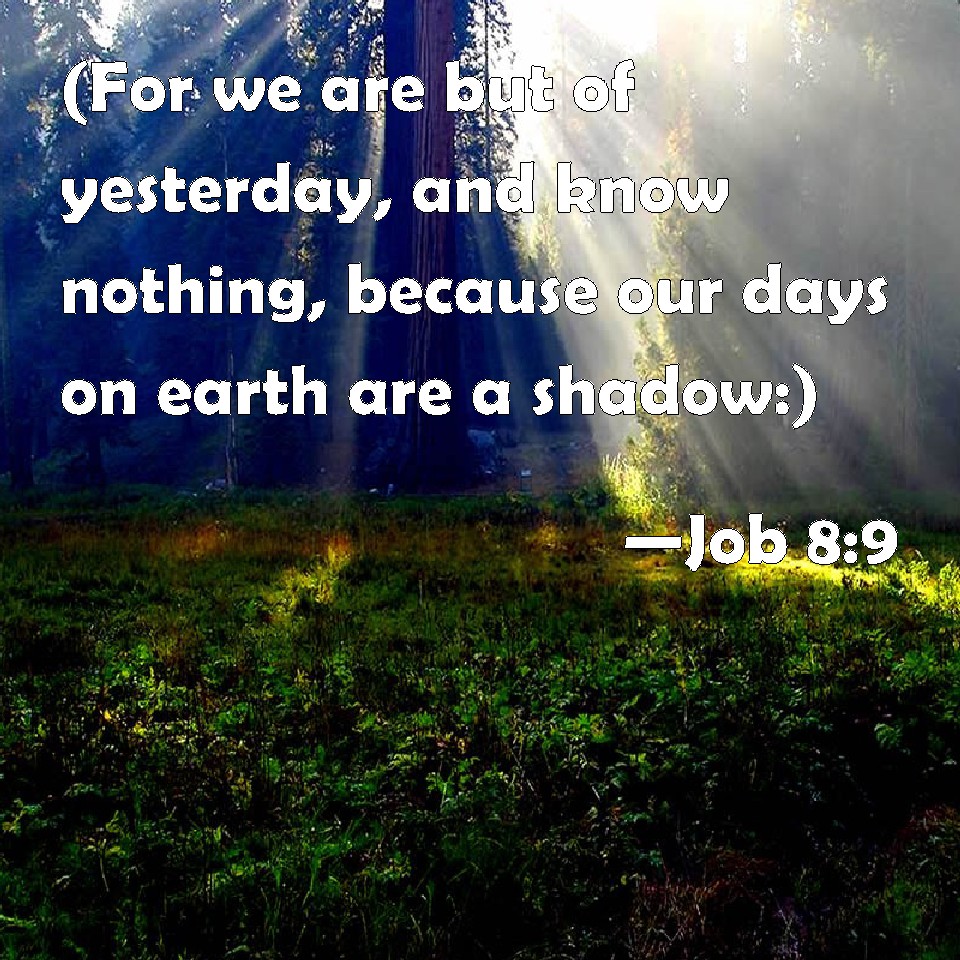 Choose a Background Job 8:9 (For we are but of yesterday, and know nothing, because our days on earth are a shadow:) KJV: (For we are but of yesterday, and know nothing, because our days upon earth are a shadow:) DRB: (For we are but of yesterday, and are ignorant that our days upon earth are but a shadow:) DBT: For we are but of yesterday, and know nothing, for our days upon earth are a shadow. ERV: (For we are but of yesterday, and know nothing, because our days upon earth are a shadow:) WBT: (For we are but of yesterday, and know nothing, because our days upon earth are a shadow:) WEB: (For we are but of yesterday, and know nothing, because our days on earth are a shadow.) YLT: (For of yesterday we are, and we know not, For a shadow are our days on earth.)Links Job 8:9 NIV • Job 8:9 NLT • Job 8:9 ESV • Job 8:9 NASB • Job 8:9 KJV • Job 8:9 Interlinear • Job 8:9 Commentaries • Job 8:9 Parallel Texts • Job 8:9 Bible Apps • Job 8:9 Parallel • Bible Hub |