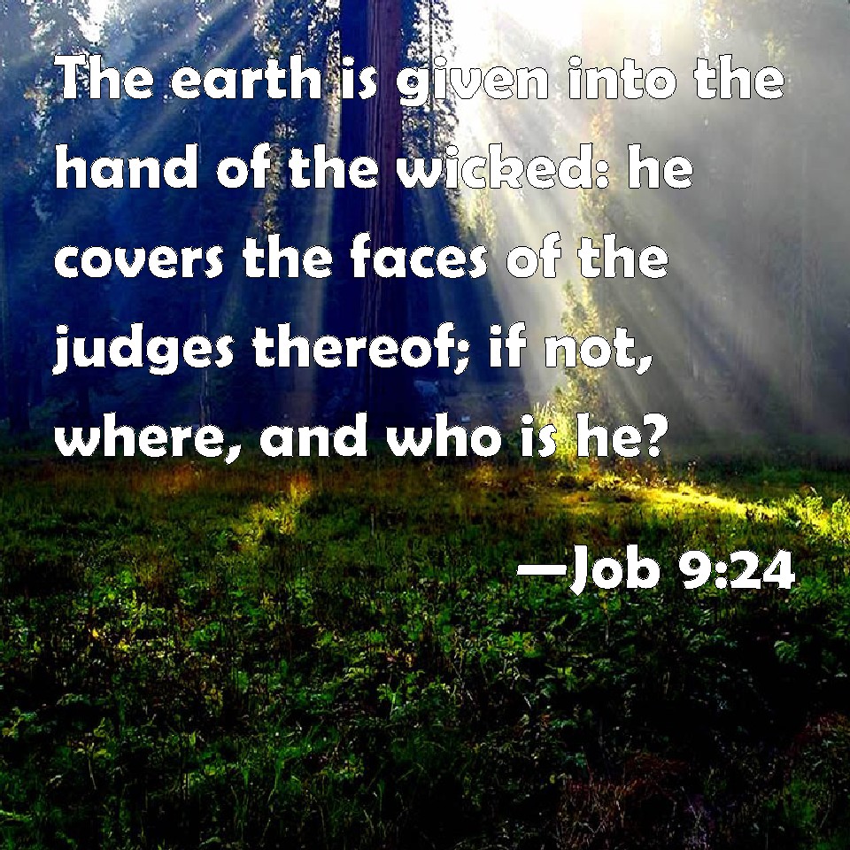Choose a Background Job 9:24 The earth is given into the hand of the wicked: he covers the faces of the judges thereof; if not, where, and who is he? KJV: The earth is given into the hand of the wicked: he covereth the faces of the judges thereof; if not, where, and who is he? DRB: The earth is given into the hand of the wicked, he covereth the face of the judges thereof: and if it be not he, who is it then? DBT: The earth is given over into the hand of the wicked man; he covereth the faces of its judges. If not, who then is it? ERV: The earth is given into the hand of the wicked: he covereth the faces of the judges thereof; if it be not he, who then is it? WBT: The earth is given into the hand of the wicked: he covereth the faces of its judges; if not, where, and who is he? WEB: The earth is given into the hand of the wicked. He covers the faces of its judges. If not he, then who is it? YLT: Earth hath been given Into the hand of the wicked one. The face of its judges he covereth, If not — where, who is he?Links Job 9:24 NIV • Job 9:24 NLT • Job 9:24 ESV • Job 9:24 NASB • Job 9:24 KJV • Job 9:24 Interlinear • Job 9:24 Commentaries • Job 9:24 Parallel Texts • Job 9:24 Bible Apps • Job 9:24 Parallel • Bible Hub |