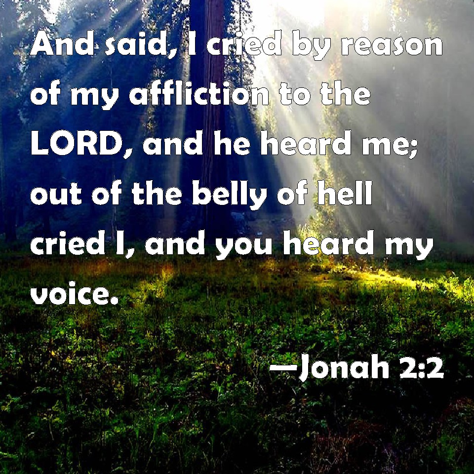Choose a Background Jonah 2:2 And said, I cried by reason of my affliction to the LORD, and he heard me; out of the belly of hell cried I, and you heard my voice. KJV: And said, I cried by reason of mine affliction unto the LORD, and he heard me; out of the belly of hell cried I, and thou heardest my voice. DRB: And he said: I cried out of my affliction to the Lord, and he heard me: I cried out of the belly of hell, and thou hast heard my voice. DBT: and he said: I cried by reason of my distress unto Jehovah, and he answered me; Out of the belly of Sheol cried I: thou heardest my voice. ERV: And he said, I called by reason of mine affliction unto the LORD, and he answered me; out of the belly of hell cried I, and thou heardest my voice. WBT: And said, I cried by reason of my affliction to the LORD, and he heard me; out of the belly of hell cried I, and thou heardst my voice. WEB: He said, "I called because of my affliction to Yahweh. He answered me. Out of the belly of Sheol I cried. You heard my voice. YLT: And he saith: I called, because of my distress, to Jehovah, And He doth answer me, From the belly of sheol I have cried, Thou hast heard my voice.Links Jonah 2:2 NIV • Jonah 2:2 NLT • Jonah 2:2 ESV • Jonah 2:2 NASB • Jonah 2:2 KJV • Jonah 2:2 Interlinear • Jonah 2:2 Commentaries • Jonah 2:2 Parallel Texts • Jonah 2:2 Bible Apps • Jonah 2:2 Parallel • Bible Hub |