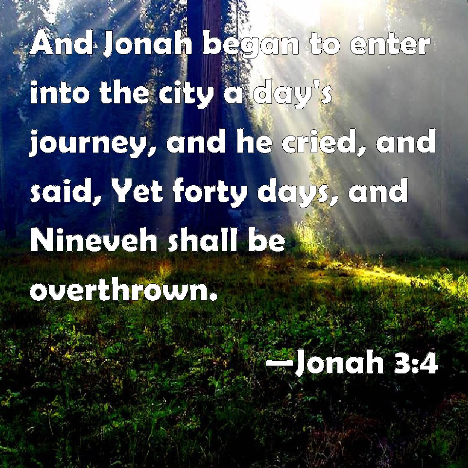 Choose a Background Jonah 3:4 And Jonah began to enter into the city a day's journey, and he cried, and said, Yet forty days, and Nineveh shall be overthrown. KJV: And Jonah began to enter into the city a day's journey, and he cried, and said, Yet forty days, and Nineveh shall be overthrown. DRB: And Jonas began to enter into the city one day's journey: and he cried, and said: Yet forty days, and Ninive shall be destroyed. DBT: And Jonah began to enter into the city a day's journey, and he cried and said, Yet forty days, and Nineveh shall be overthrown! ERV: And Jonah began to enter into the city a day's journey, and he cried, and said, Yet forty days, and Nineveh shall be overthrown. WBT: And Jonah began to enter into the city a day's journey, and he cried, and said, Yet forty days, and Nineveh shall be overthrown. WEB: Jonah began to enter into the city a day's journey, and he cried out, and said, "In forty days, Nineveh will be overthrown!" YLT: And Jonah beginneth to go in to the city a journey of one day, and proclaimeth, and saith, 'Yet forty days — and Nineveh is overturned.'Links Jonah 3:4 NIV • Jonah 3:4 NLT • Jonah 3:4 ESV • Jonah 3:4 NASB • Jonah 3:4 KJV • Jonah 3:4 Interlinear • Jonah 3:4 Commentaries • Jonah 3:4 Parallel Texts • Jonah 3:4 Bible Apps • Jonah 3:4 Parallel • Bible Hub |