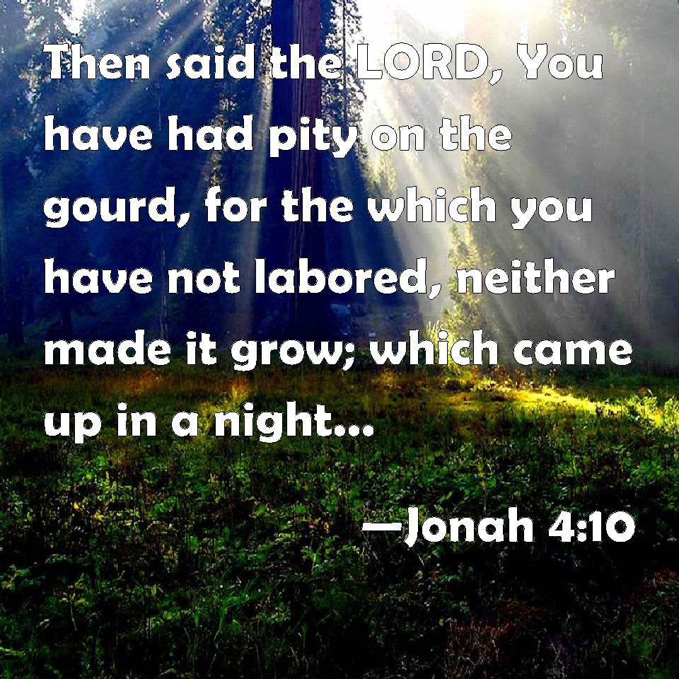 WBT:  Then said the LORD, Thou hast had pity on the gourd, for which thou hast not labored, neither made it grow; which came up in a night, and perished in a night: