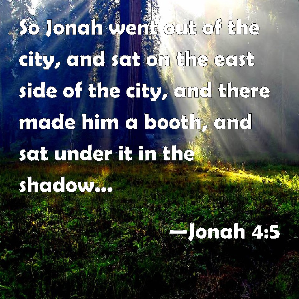 Choose a Background Jonah 4:5 So Jonah went out of the city, and sat on the east side of the city, and there made him a booth, and sat under it in the shadow, till he might see what would become of the city. KJV: So Jonah went out of the city, and sat on the east side of the city, and there made him a booth, and sat under it in the shadow, till he might see what would become of the city. DRB: Then Jonas went out of the city, and sat toward the east side of the city: and he made himself a booth there, and he sat under it in the shadow, till he might see what would befall the city. DBT: And Jonah went out of the city, and sat on the east side of the city, and there made him a booth, and sat under it in the shade, till he might see what would become of the city. ERV: Then Jonah went out of the city, and sat on the east side of the city, and there made him a booth, and sat under it in the shadow, till he might see what would become of the city. WBT: So Jonah went out of the city, and sat on the east side of the city, and there made him a booth, and sat under it in the shade, till he might see what would become of the city. WEB: Then Jonah went out of the city, and sat on the east side of the city, and there made himself a booth, and sat under it in the shade, until he might see what would become of the city. YLT: And Jonah goeth forth from the city, and sitteth on the east of the city, and maketh to himself there a booth, and sitteth under it in the shade, till that he seeth what is in the city.Links Jonah 4:5 NIV • Jonah 4:5 NLT • Jonah 4:5 ESV • Jonah 4:5 NASB • Jonah 4:5 KJV • Jonah 4:5 Interlinear • Jonah 4:5 Commentaries • Jonah 4:5 Parallel Texts • Jonah 4:5 Bible Apps • Jonah 4:5 Parallel • Bible Hub |