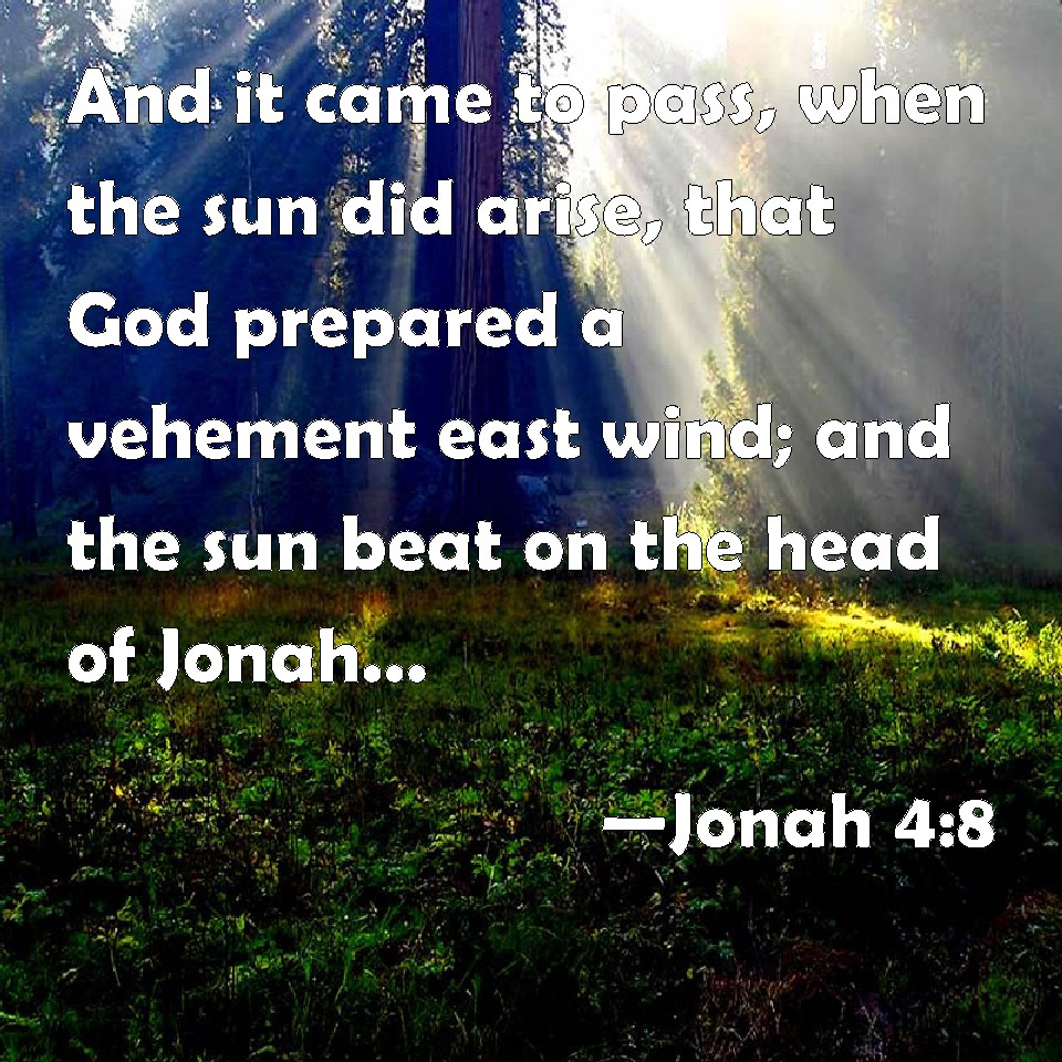 WEB:  It happened, when the sun arose, that God prepared a sultry east wind; and the sun beat on Jonah's head, so that he fainted, and requested for himself that he might die, and said, "It is better for me to die than to live."
