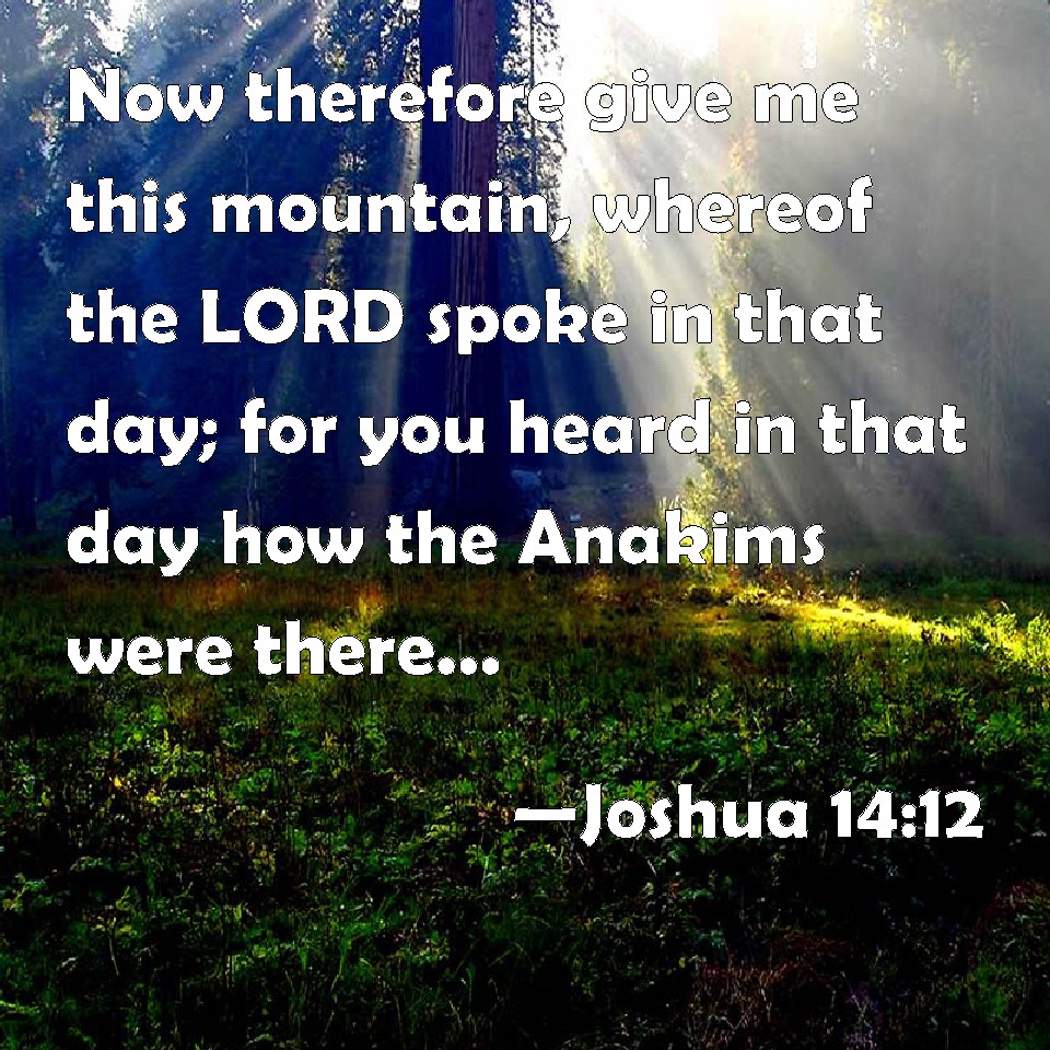Choose a Background Joshua 14:12 Now therefore give me this mountain, whereof the LORD spoke in that day; for you heard in that day how the Anakims were there, and that the cities were great and fenced: if so be the LORD will be with me, then I shall be able to drive them out, as the LORD said. KJV: Now therefore give me this mountain, whereof the LORD spake in that day; for thou heardest in that day how the Anakims were there, and that the cities were great and fenced: if so be the LORD will be with me, then I shall be able to drive them out, as the LORD said. DRB: Give me therefore this mountain, which the Lord promised, in thy hearing also, wherein are the Enacims, and cities great and strong: if so be the Lord will be with me, and I shall be able to destroy them, as he promised me. DBT: And now give me this mountain, of which Jehovah spoke in that day; for thou heardest in that day that Anakim are there, and great fortified cities. If so be Jehovah shall be with me, then I shall dispossess them, as Jehovah said. ERV: Now therefore give me this mountain, whereof the LORD spake in that day; for thou heardest in that day how the Anakim were there, and cities great and fenced: it may be that the LORD will be with me, and I shall drive them out, as the LORD spake. WBT: Now therefore give me this mountain, of which the LORD spoke in that day; for thou heardest in that day how the Anakims were there, and that the cities were great and fortified: if the LORD will be with me, then I shall be able to drive them out, as the LORD said. WEB: Now therefore give me this hill country, of which Yahweh spoke in that day; for you heard in that day how the Anakim were there, and great and fortified cities. It may be that Yahweh will be with me, and I shall drive them out, as Yahweh spoke." YLT: And now, give to me this hill-country, of which Jehovah spake in that day, for thou didst hear in that day, for Anakim are there, and cities, great, fenced; if so be Jehovah is with me, then I have dispossessed them, as Jehovah hath spoken.'Links Joshua 14:12 NIV • Joshua 14:12 NLT • Joshua 14:12 ESV • Joshua 14:12 NASB • Joshua 14:12 KJV • Joshua 14:12 Interlinear • Joshua 14:12 Commentaries • Joshua 14:12 Parallel Texts • Joshua 14:12 Bible Apps • Joshua 14:12 Parallel • Bible Hub |