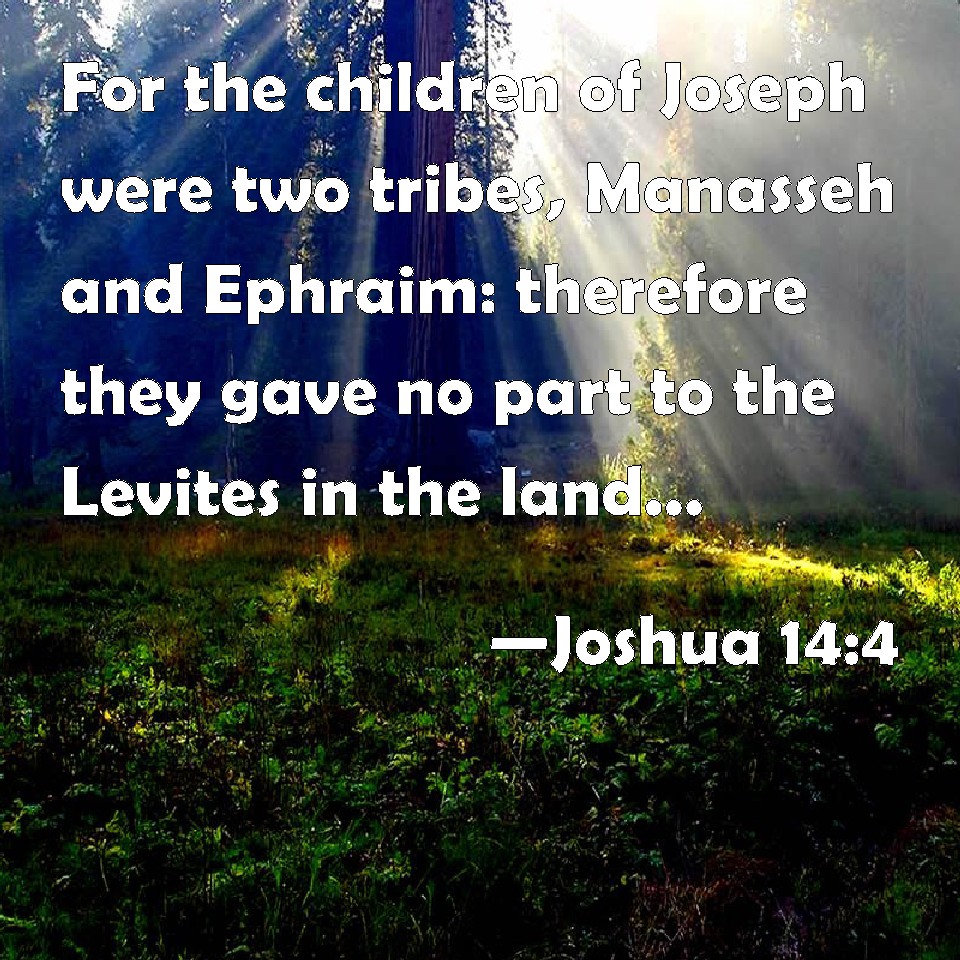 Choose a Background Joshua 14:4 For the children of Joseph were two tribes, Manasseh and Ephraim: therefore they gave no part to the Levites in the land, save cities to dwell in, with their suburbs for their cattle and for their substance. KJV: For the children of Joseph were two tribes, Manasseh and Ephraim: therefore they gave no part unto the Levites in the land, save cities to dwell in, with their suburbs for their cattle and for their substance. DRB: But in their place succeeded the children of Joseph divided into two tribes, of Manasses and Ephraim: neither did the Levites receive other portion of land, but cities to dwell in, and their suburbs to feed their beasts and flocks. DBT: For the children of Joseph were two tribes, Manasseh and Ephraim; and they gave no part to the Levites in the land, save cities to dwell in, and their suburbs for their cattle and for their substance. ERV: For the children of Joseph were two tribes, Manasseh and Ephraim: and they gave no portion unto the Levites in the land, save cities to dwell in, with the suburbs thereof for their cattle and for their substance. WBT: For the children of Joseph were two tribes, Manasseh and Ephraim: therefore they gave no part to the Levites in the land, save cities to dwell in, with their suburbs for their cattle, and for their substance. WEB: For the children of Joseph were two tribes, Manasseh and Ephraim: and they gave no portion to the Levites in the land, except cities to dwell in, with their suburbs for their livestock and for their property. YLT: for the sons of Joseph hath been two tribes, Manasseh and Ephraim, and they have not given a portion to the Levites in the land, except cities to dwell in, and their suburbs for their cattle, and for their possessions;Links Joshua 14:4 NIV • Joshua 14:4 NLT • Joshua 14:4 ESV • Joshua 14:4 NASB • Joshua 14:4 KJV • Joshua 14:4 Interlinear • Joshua 14:4 Commentaries • Joshua 14:4 Parallel Texts • Joshua 14:4 Bible Apps • Joshua 14:4 Parallel • Bible Hub |