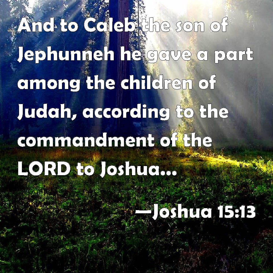 Choose a Background Joshua 15:13 And to Caleb the son of Jephunneh he gave a part among the children of Judah, according to the commandment of the LORD to Joshua, even the city of Arba the father of Anak, which city is Hebron. KJV: And unto Caleb the son of Jephunneh he gave a part among the children of Judah, according to the commandment of the LORD to Joshua, even the city of Arba the father of Anak, which city is Hebron. DRB: But to Caleb the son of Jephone he gave a portion in the midst of the children of Juda, as the Lord had commanded him: Cariath-Arbe the father of Enac. which is Hebron. DBT: And to Caleb the son of Jephunneh he gave a portion among the children of Judah according to the commandment of Jehovah to Joshua, the city of Arba, the father of Anak, that is, Hebron. ERV: And unto Caleb the son of Jephunneh he gave a portion among the children of Judah, according to the commandment of the LORD to Joshua, even Kirjath-arba, which Arba was the father of Anak (the same is Hebron). WBT: And to Caleb the son of Jephunneh he gave a part among the children of Judah, according to the commandment of the LORD to Joshua, even the city of Arba the father of Anak, which city is Hebron. WEB: To Caleb the son of Jephunneh he gave a portion among the children of Judah, according to the commandment of Yahweh to Joshua, even Kiriath Arba, named after the father of Anak (the same is Hebron). YLT: And to Caleb son of Jephunneh hath he given a portion in the midst of the sons of Judah, according to the command of Jehovah to Joshua, even the city of Arba, father of Anak — it is Hebron.Links Joshua 15:13 NIV • Joshua 15:13 NLT • Joshua 15:13 ESV • Joshua 15:13 NASB • Joshua 15:13 KJV • Joshua 15:13 Interlinear • Joshua 15:13 Commentaries • Joshua 15:13 Parallel Texts • Joshua 15:13 Bible Apps • Joshua 15:13 Parallel • Bible Hub |