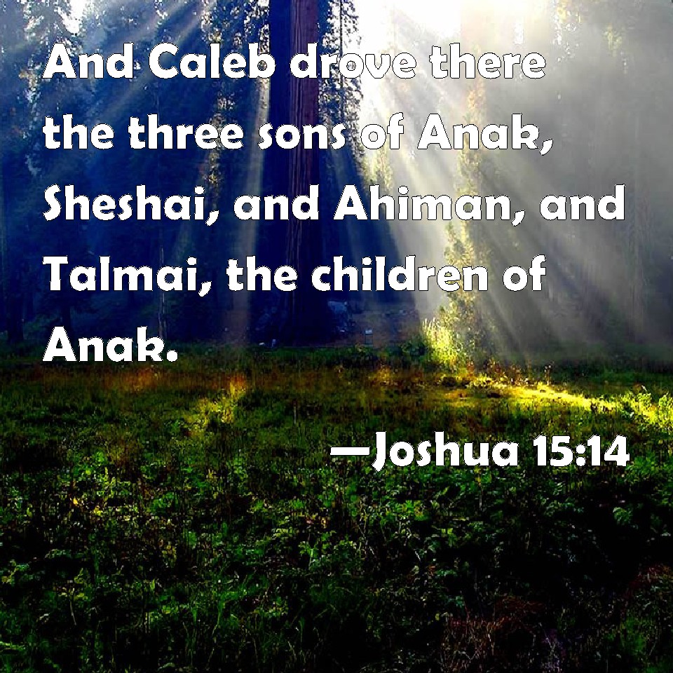 Choose a Background Joshua 15:14 And Caleb drove there the three sons of Anak, Sheshai, and Ahiman, and Talmai, the children of Anak. KJV: And Caleb drove thence the three sons of Anak, Sheshai, and Ahiman, and Talmai, the children of Anak. DRB: And Caleb destroyed out of it the three sons of Ehac, Sesai and Ahiman. and Tholmai of the race of Enac. DBT: And thence Caleb dispossessed the three sons of Anak, Sheshai and Ahiman and Talmai, who were born of Anak. ERV: And Caleb drove out thence the three sons of Anak, Sheshai, and Ahiman, and Talmai, the children of Anak. WBT: And Caleb drove thence the three sons of Anak, Sheshai, and Ahiman, and Talmai, the children of Anak. WEB: Caleb drove out the three sons of Anak: Sheshai, and Ahiman, and Talmai, the children of Anak. YLT: And Caleb is dispossessing thence the three sons of Anak, Sheshai, and Ahiman, and Talmai, children of Anak,Links Joshua 15:14 NIV • Joshua 15:14 NLT • Joshua 15:14 ESV • Joshua 15:14 NASB • Joshua 15:14 KJV • Joshua 15:14 Interlinear • Joshua 15:14 Commentaries • Joshua 15:14 Parallel Texts • Joshua 15:14 Bible Apps • Joshua 15:14 Parallel • Bible Hub |