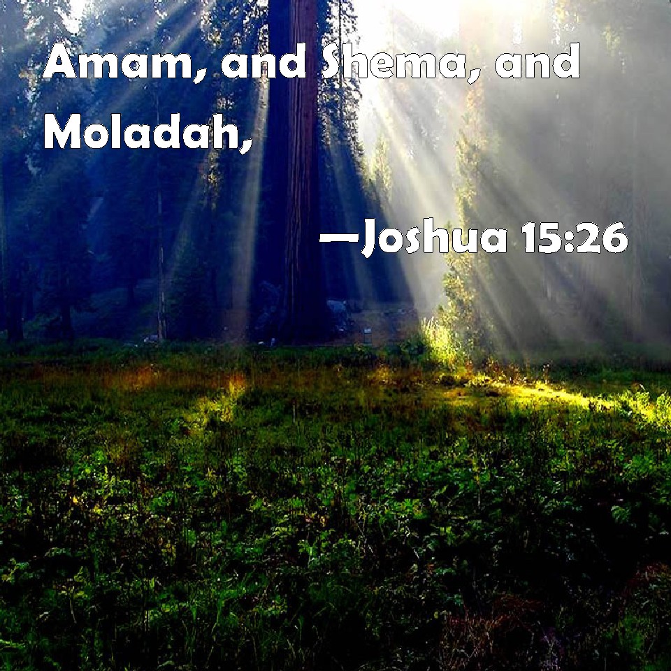 Choose a Background Joshua 15:26 Amam, and Shema, and Moladah, KJV: Amam, and Shema, and Moladah, DRB: Amam, Sama and Molada, DBT: Amam, and Shema, and Molada, ERV: Amam, and Shema, and Moladah; WBT: Aman, and Shema, and Moladah, WEB: Amam, Shema, Moladah, YLT: Amam, and Shema, and Moladah,Links Joshua 15:26 NIV • Joshua 15:26 NLT • Joshua 15:26 ESV • Joshua 15:26 NASB • Joshua 15:26 KJV • Joshua 15:26 Interlinear • Joshua 15:26 Commentaries • Joshua 15:26 Parallel Texts • Joshua 15:26 Bible Apps • Joshua 15:26 Parallel • Bible Hub |