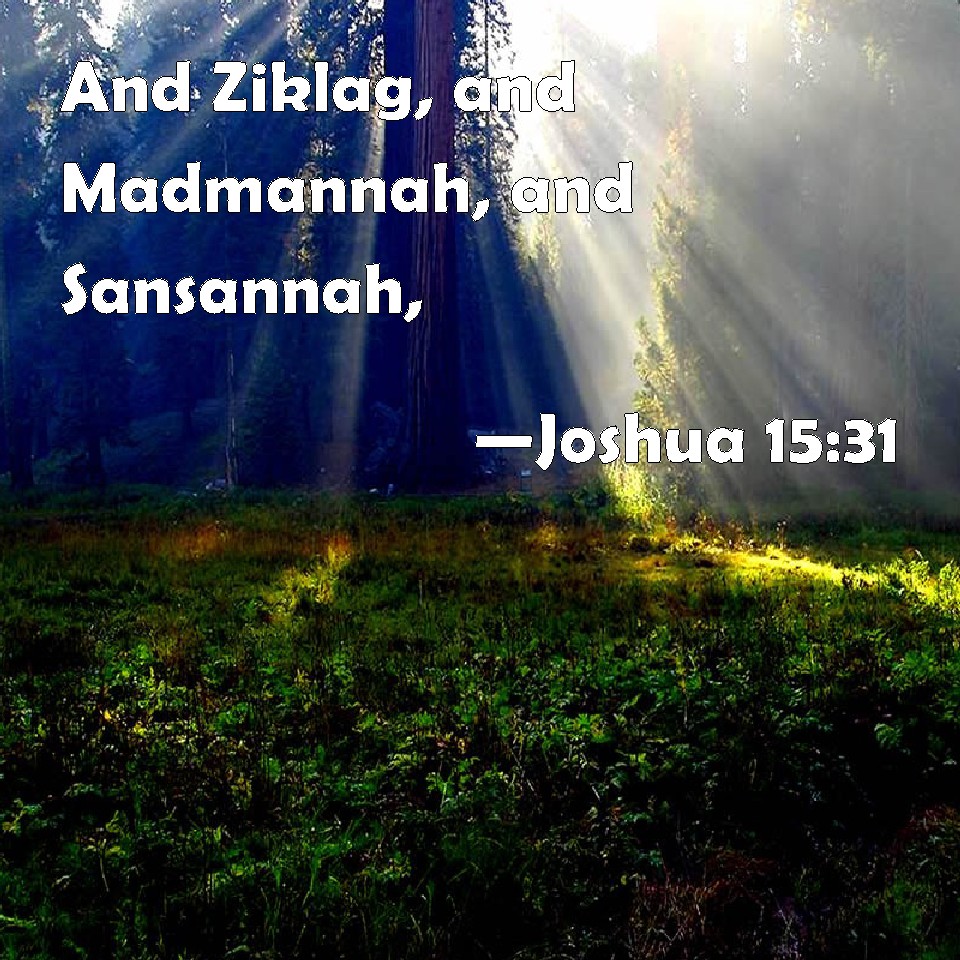 Choose a Background Joshua 15:31 And Ziklag, and Madmannah, and Sansannah, KJV: And Ziklag, and Madmannah, and Sansannah, DRB: And Siceleg and Medemena and Sensenna, DBT: and Ziklag, and Madmannah, and Sansanna, ERV: and Ziklag, and Madmannah, and Sansannah; WBT: And Ziglag, and Madmannah, and Sansannah, WEB: Ziklag, Madmannah, Sansannah, YLT: and Ziklag, and Madmannah, and Sansannah,Links Joshua 15:31 NIV • Joshua 15:31 NLT • Joshua 15:31 ESV • Joshua 15:31 NASB • Joshua 15:31 KJV • Joshua 15:31 Interlinear • Joshua 15:31 Commentaries • Joshua 15:31 Parallel Texts • Joshua 15:31 Bible Apps • Joshua 15:31 Parallel • Bible Hub |