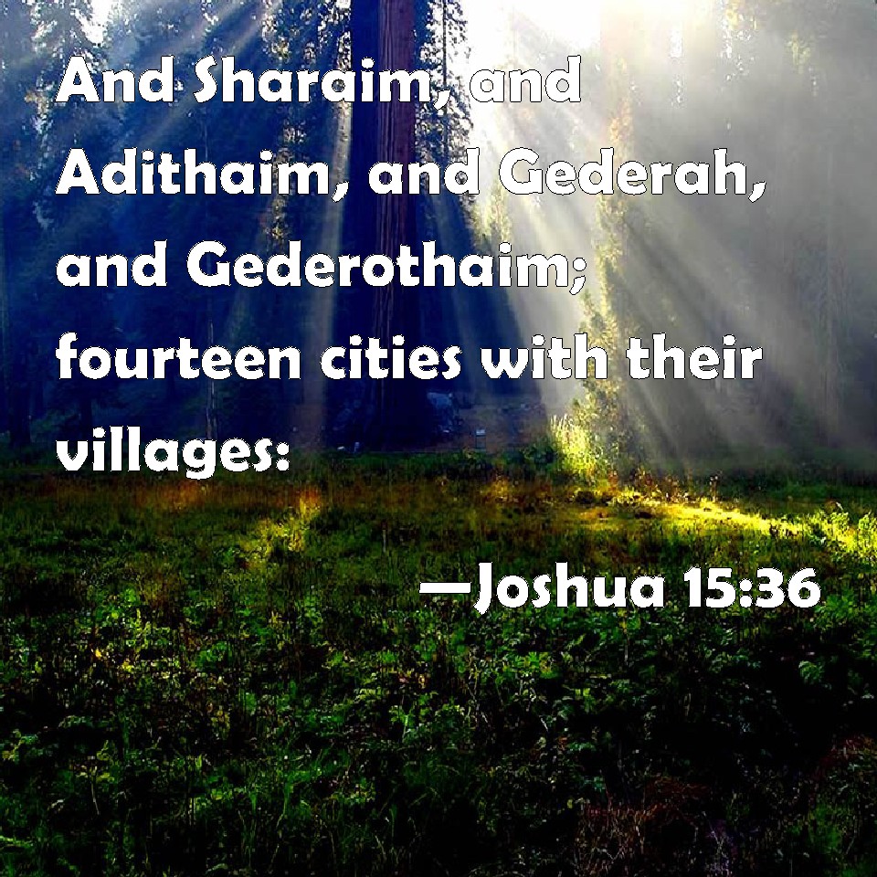Choose a Background Joshua 15:36 And Sharaim, and Adithaim, and Gederah, and Gederothaim; fourteen cities with their villages: KJV: And Sharaim, and Adithaim, and Gederah, and Gederothaim; fourteen cities with their villages: DRB: And Saraim and Adithaim and Gedera and Gederothaim: fourteen cities, and their villages. DBT: and Shaaraim, and Adithaim, and Gederah, and Gederothaim: fourteen cities and their hamlets. ERV: and Shaaraim, and Adithaim, and Gederah, and Gederothaim; fourteen cities with their villages. WBT: And Sharaim, and Adithaim, and Gederah, and Gederothaim; fourteen cities with their villages: WEB: Shaaraim, Adithaim and Gederah (or Gederothaim); fourteen cities with their villages. YLT: and Sharaim, and Adithaim, and Gederah, and Gederothaim; fourteen cities and their villages.Links Joshua 15:36 NIV • Joshua 15:36 NLT • Joshua 15:36 ESV • Joshua 15:36 NASB • Joshua 15:36 KJV • Joshua 15:36 Interlinear • Joshua 15:36 Commentaries • Joshua 15:36 Parallel Texts • Joshua 15:36 Bible Apps • Joshua 15:36 Parallel • Bible Hub |