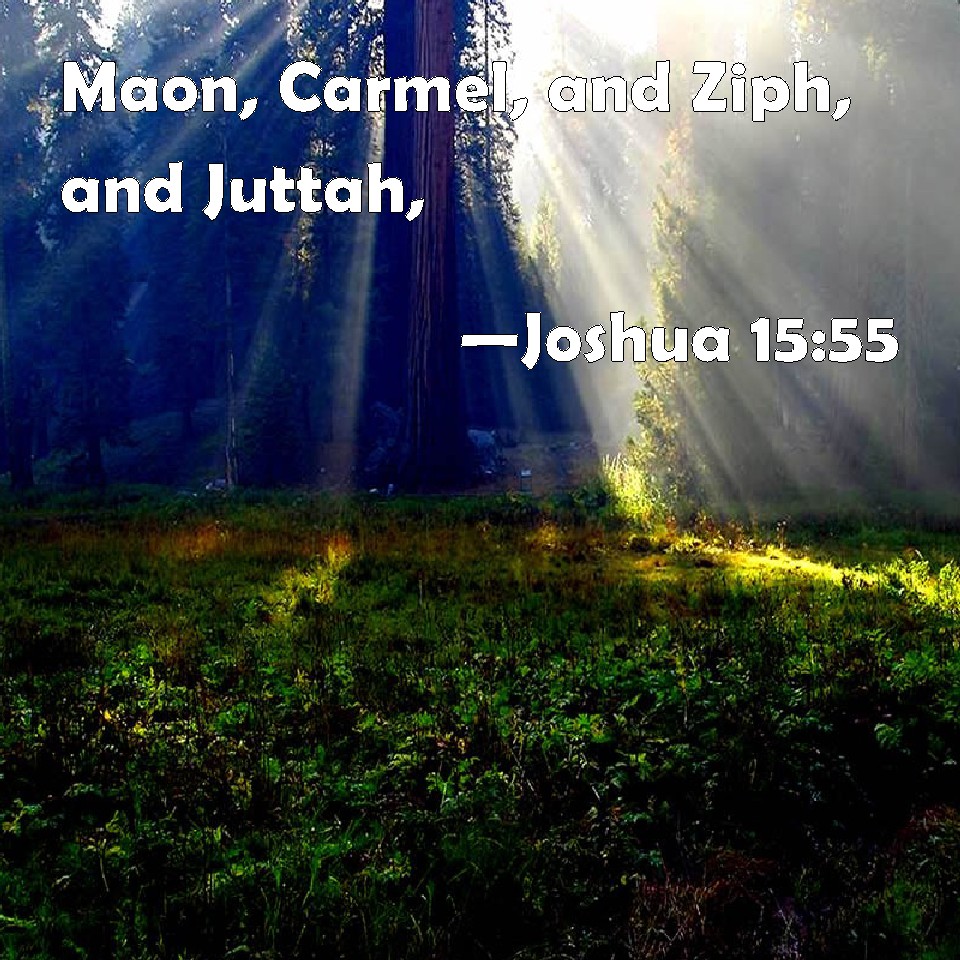 Choose a Background Joshua 15:55 Maon, Carmel, and Ziph, and Juttah, KJV: Maon, Carmel, and Ziph, and Juttah, DRB: Maon and Carmel and Ziph and Jota, DBT: Maon, Carmel, and Ziph, and Jutah, ERV: Maon, Carmel, and Ziph, and Jutah; WBT: Maon, Carmel, and Ziph, and Juttah, WEB: Maon, Carmel, Ziph, Jutah, YLT: Maon, Carmel, and Ziph, and Juttah,Links Joshua 15:55 NIV • Joshua 15:55 NLT • Joshua 15:55 ESV • Joshua 15:55 NASB • Joshua 15:55 KJV • Joshua 15:55 Interlinear • Joshua 15:55 Commentaries • Joshua 15:55 Parallel Texts • Joshua 15:55 Bible Apps • Joshua 15:55 Parallel • Bible Hub |