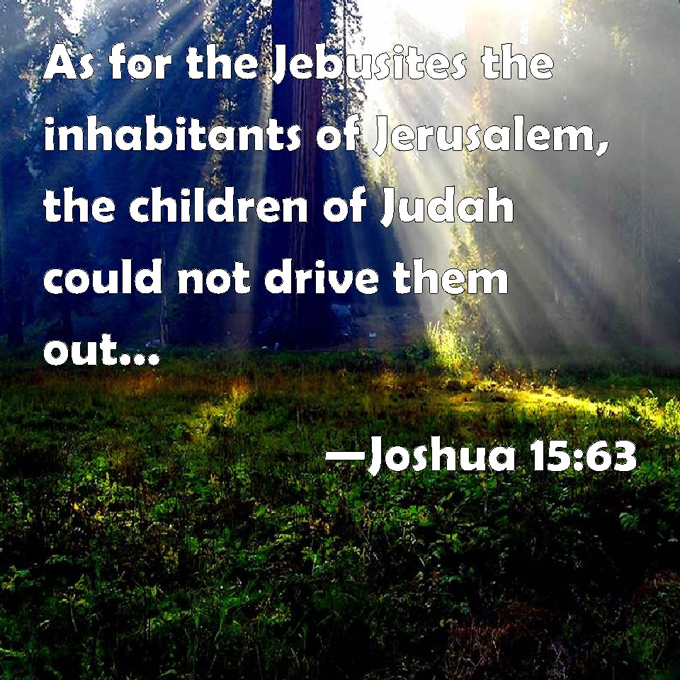 Choose a Background Joshua 15:63 As for the Jebusites the inhabitants of Jerusalem, the children of Judah could not drive them out; but the Jebusites dwell with the children of Judah at Jerusalem to this day. KJV: As for the Jebusites the inhabitants of Jerusalem, the children of Judah could not drive them out: but the Jebusites dwell with the children of Judah at Jerusalem unto this day. DRB: But the children of Juda could not destroy the Jebusite that dwelt in Jerusalem: and the Jebusite dwelt with the children of Juda in Jerusalem until this present day. DBT: But as for the Jebusites, the inhabitants of Jerusalem, the children of Judah could not dispossess them; and the Jebusites dwell with the children of Judah at Jerusalem to this day. ERV: And as for the Jebusites, the inhabitants of Jerusalem, the children of Judah could not drive them out: but the Jebusites dwelt with the children of Judah at Jerusalem, unto this day. WBT: As for the Jebusites, the inhabitants of Jerusalem, the children of Judah could not expel them: but the Jebusites dwell with the children of Judah at Jerusalem to this day. WEB: As for the Jebusites, the inhabitants of Jerusalem, the children of Judah couldn't drive them out; but the Jebusites live with the children of Judah at Jerusalem to this day. YLT: As to the Jebusites, inhabitants of Jerusalem, the sons of Judah have not been able to dispossess them, and the Jebusite dwelleth with the sons of Judah in Jerusalem unto this day.Links Joshua 15:63 NIV • Joshua 15:63 NLT • Joshua 15:63 ESV • Joshua 15:63 NASB • Joshua 15:63 KJV • Joshua 15:63 Interlinear • Joshua 15:63 Commentaries • Joshua 15:63 Parallel Texts • Joshua 15:63 Bible Apps • Joshua 15:63 Parallel • Bible Hub |